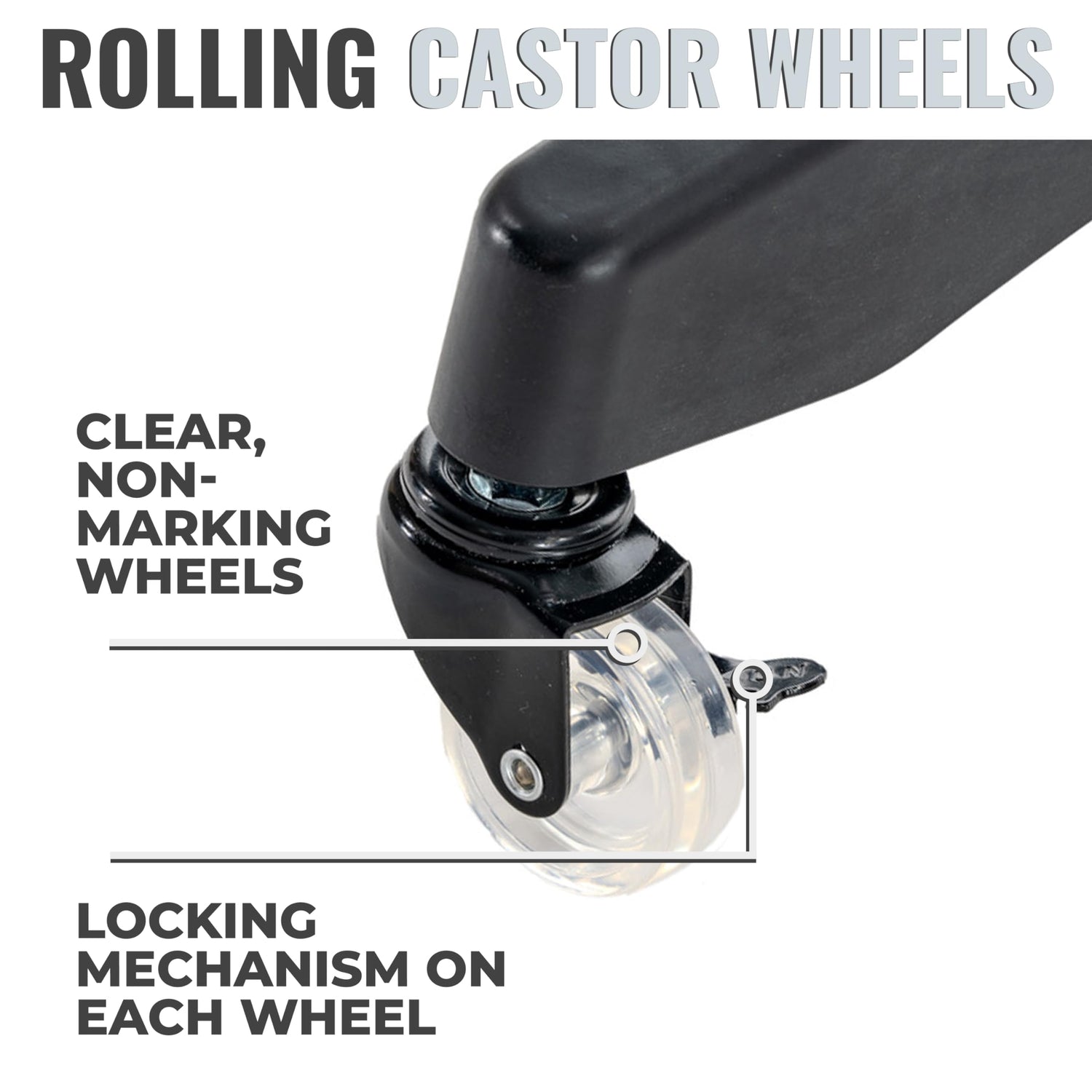 - Non-marking, scratch resistant clear castor wheels with locking device