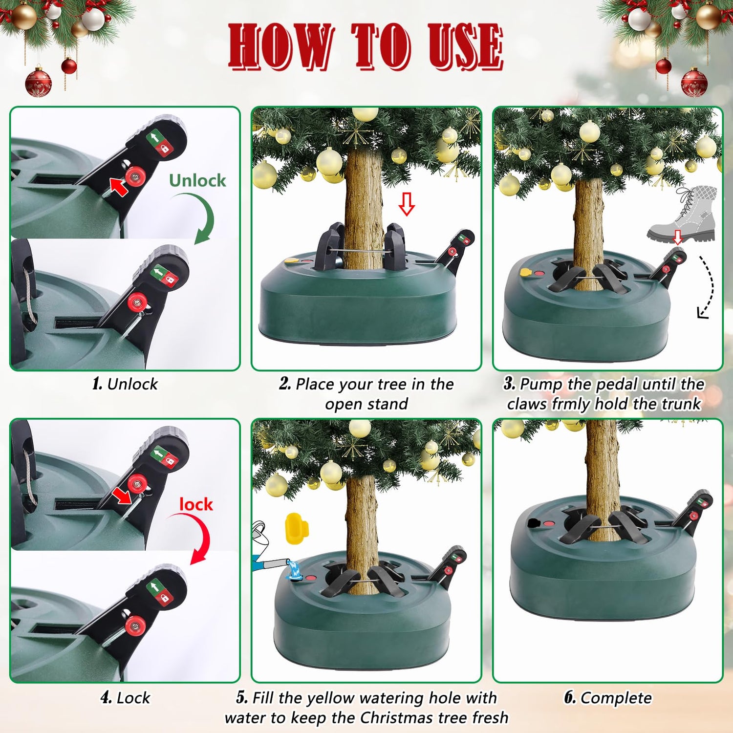 - FAST CLAMP SYSTEM:The real live christmas tree stand has innovative foot pedal fast clamp system can accommodate up to 7.5ft of real Christmas trees!! Easily and quickly install Christmas trees of various sizes. Single cable operation, easy pedal setting, no need for assembly or screws. Gently step on the pedal to quickly and simultaneously tighten the four clamping arms through mechanical principles, firmly fixing the tree trunk