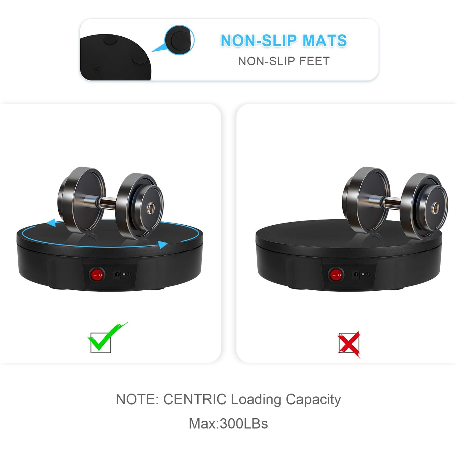 - 【Smooth Rotation and Lower Noise】: 300 lbs centric loading capacity, 11.8 inch diameter, net weight 3 lbs, adapter power supply :110~220 V to DC 15V. Convenient to carry and keep.
