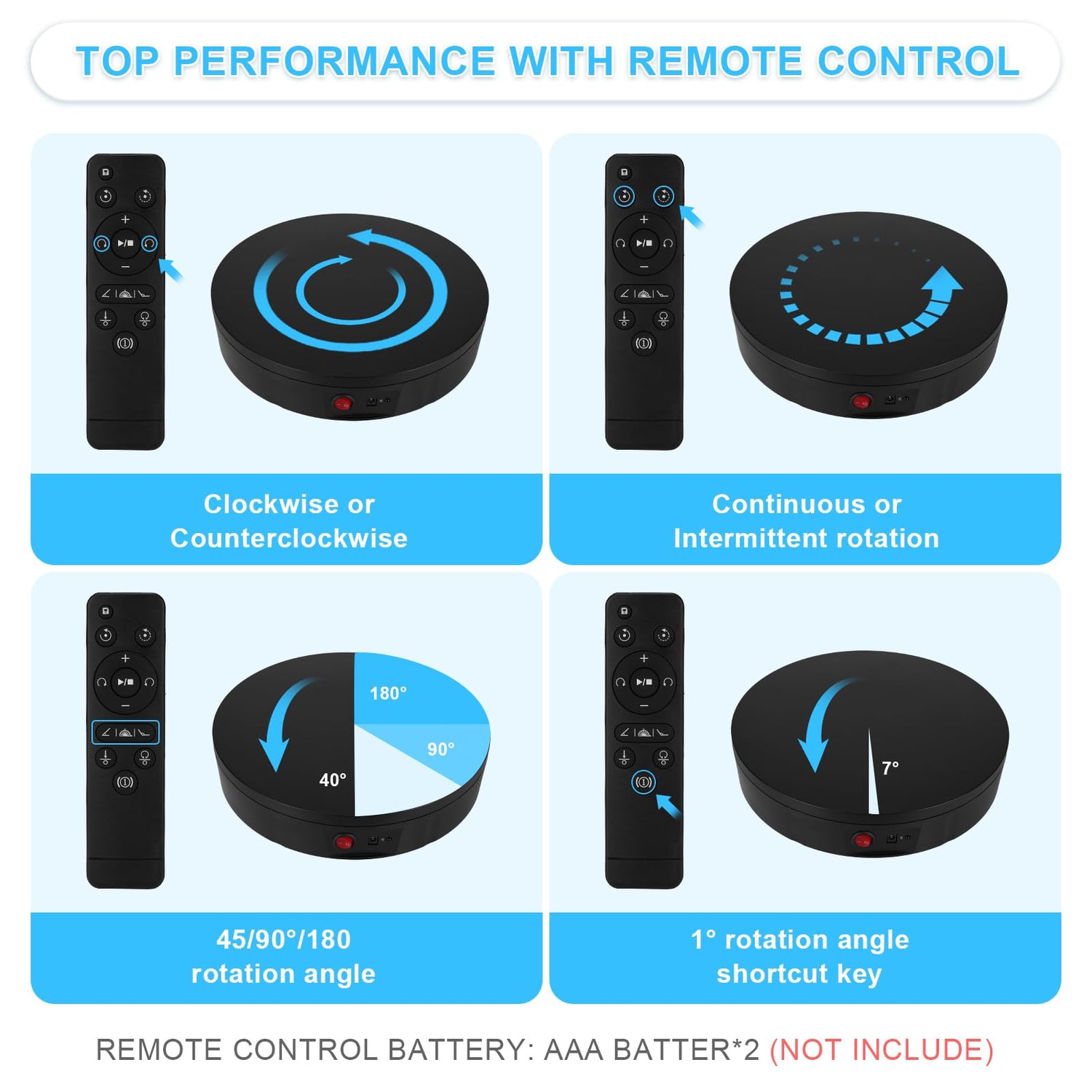 - 【Remote Control Speed & Angle】: The speed range is 22-60 sec/rev (the fastest speed is 22 seconds per circle & the lowest speed is 60 seconds per circle) total 10 gears speed adjustable. Infrared remote control with controller available continuous and intermittent rotation modes, 45°/90°/180° angle circulation turning modes.
