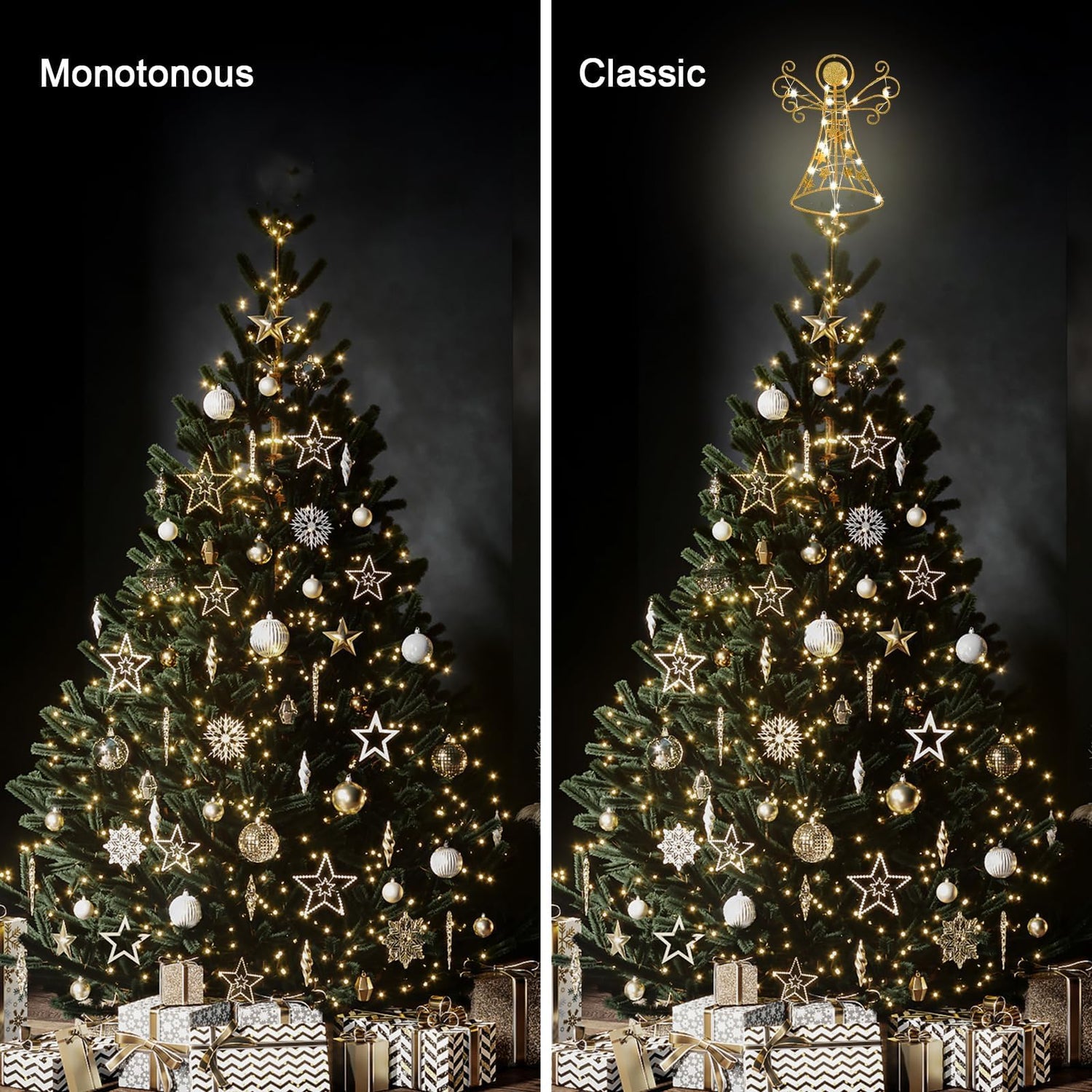 - 🌟Christmas Angel Tree Topper - Glittered bilayer Angel tree topper. pretty vintage and classic.A glittery finish that is sure to add sparkle to your holiday decor. A beautiful and festive way to add to and accent the decor of your Christmas tree.