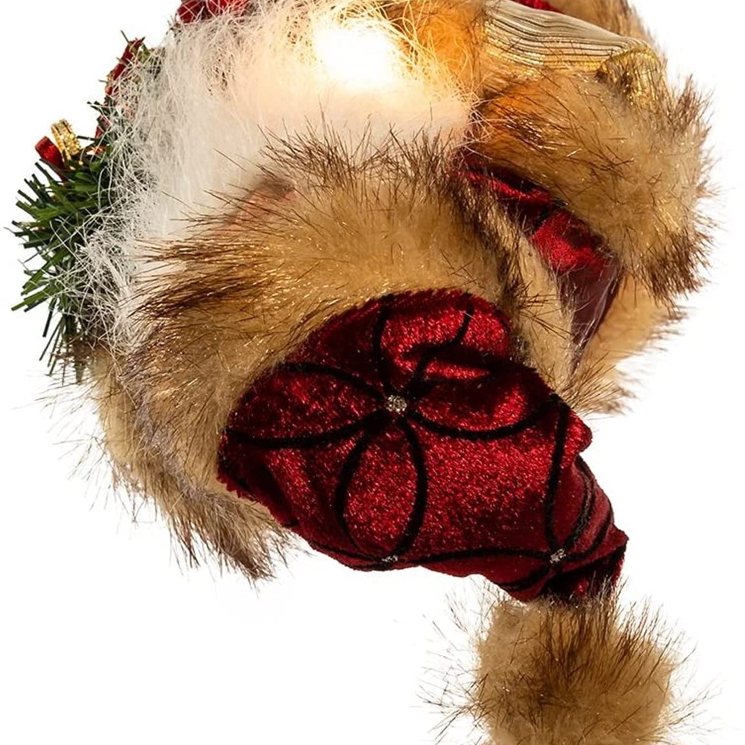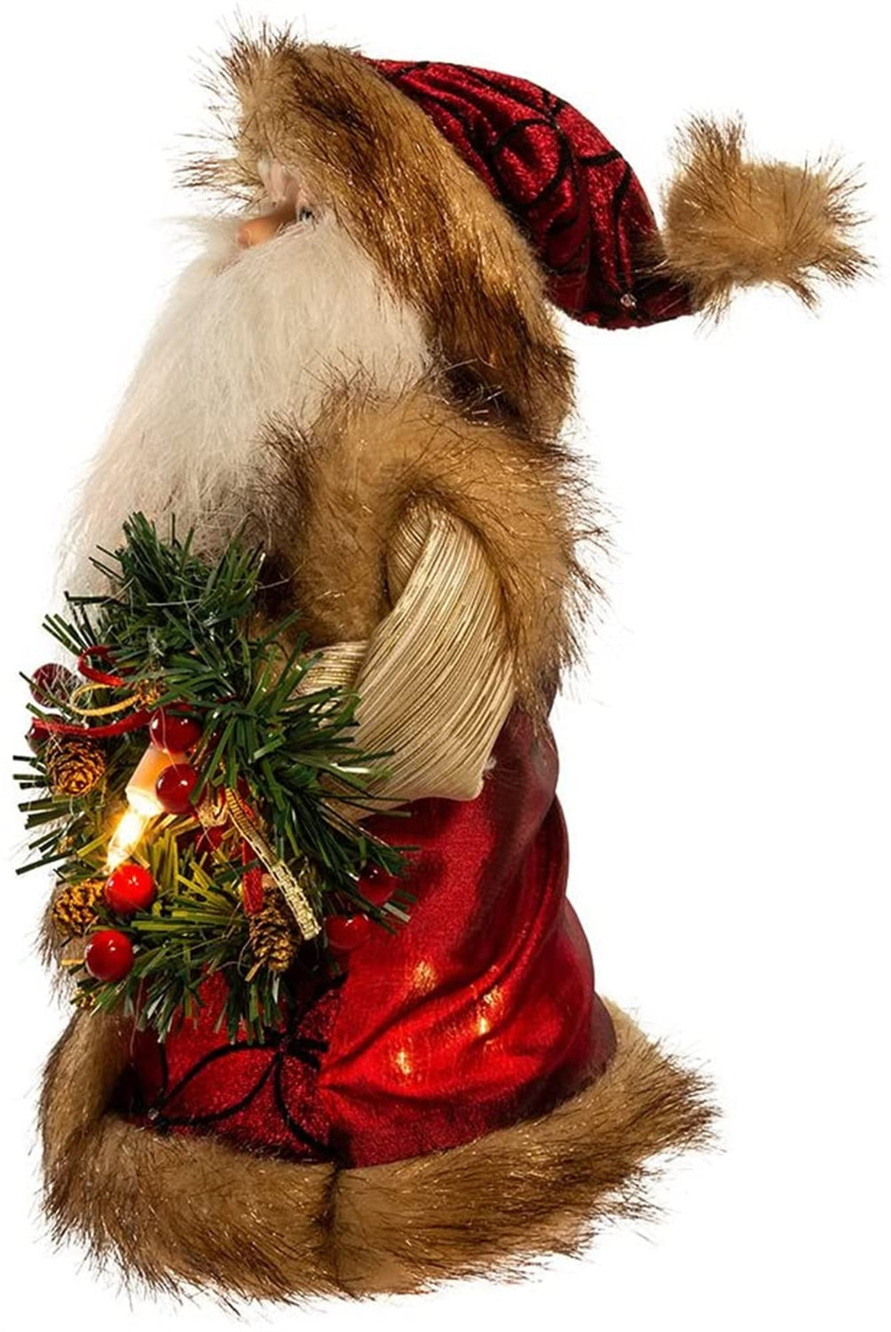 Details: Complete the lighting and decor of your Christmas tree with Kurt Adler's 10-inch 10-light burgundy and brown Santa treetop. This beautiful 12" treetop featured Santa Claus in a long burgundy coat and hat trimmed in brown faux fur. He is lit from within by 10 lights for a festive glow.