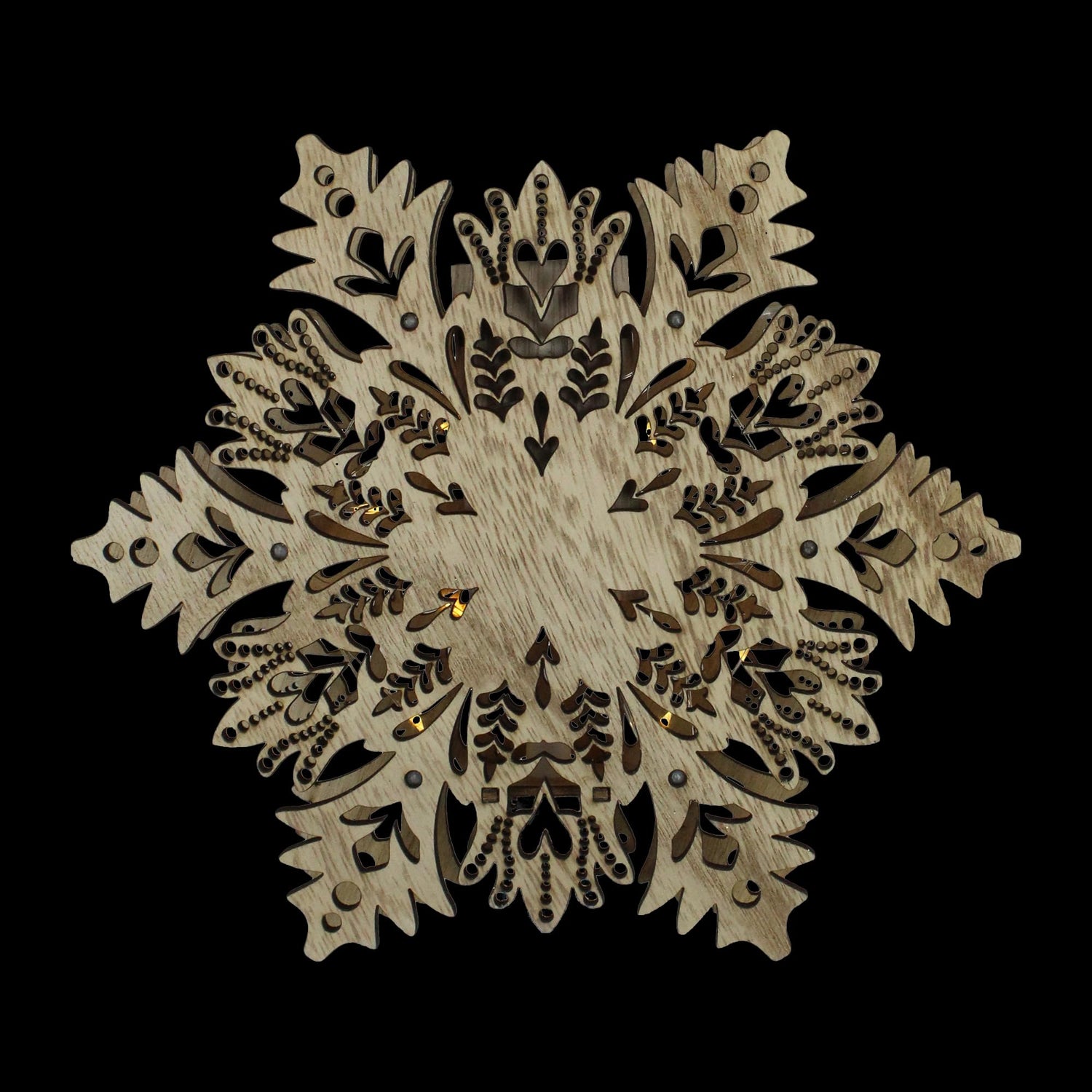 Details: Light up your holiday decor with this unique battery-operated snowflake tree topper. The clear lights illuminate not only the snowflake itself but also the surrounding branches of your tree. Add a bit of rustic charm with this snowflake tree topper. Product Features:. Color: clear bulbs / clear wire. Number of bulbs: 10. Bulb size: micro. Double-sided design. Wooden snowflake design with cutouts Additional Product Features: . Super bright bulbs. UL certified and approved for indoor use only. Non-replaceable bulbs. Requires (2) "AA" batteries - not included Dimensions:. Snowlake: 7.5"H x 8.5"W x 1.25"D. Material(s): wood/plastic NOTE: Does not come with a cone for attaching to a tree