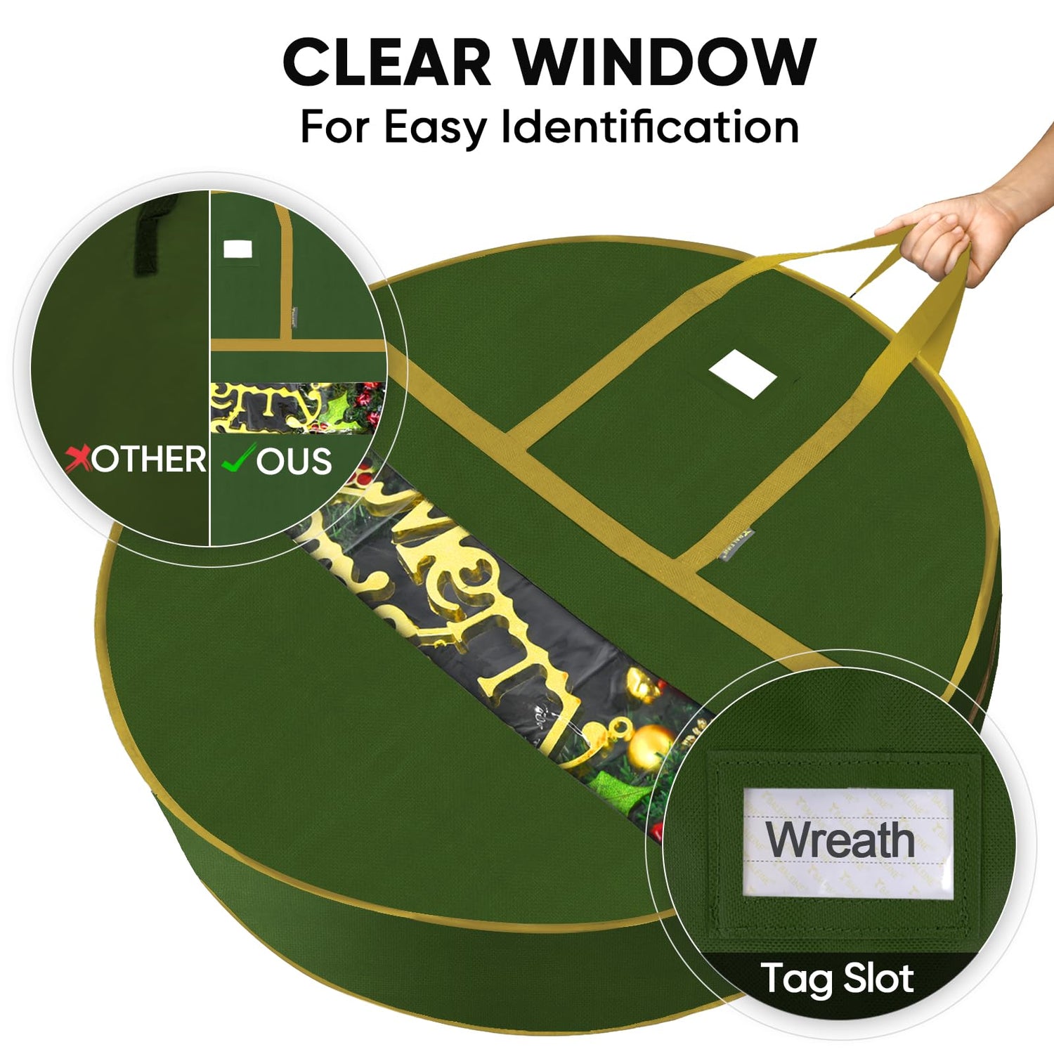 - [EASY IDENTIFICATION] The transparent middle design of our ornament storage bag allows for quick identification of holiday items inside without the need to unzip. Additionally, the attached card slot enables you to label and categorize the contents of the wreath box, ensuring neat and organized storage.