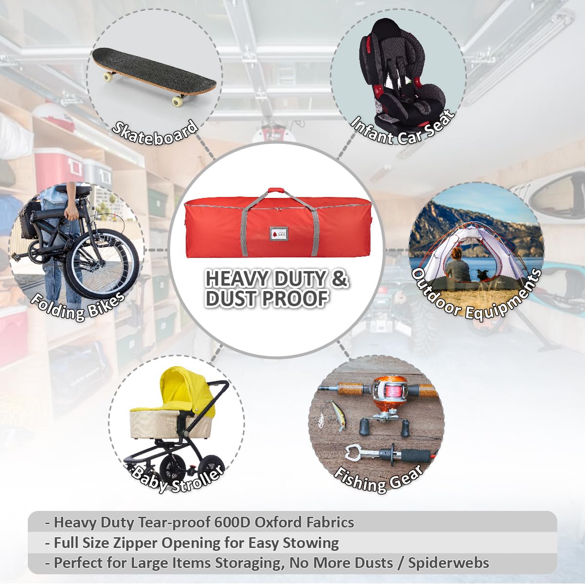 - A full size zipper opening for easy stowing of tree; Extra two padded side handles for easy fetching/ lifting/ moving purposes;