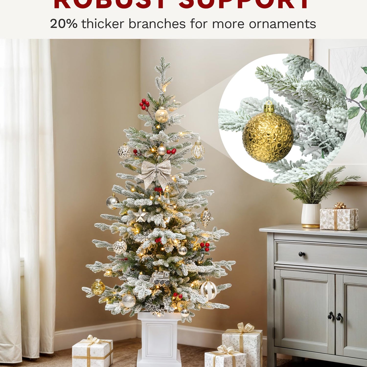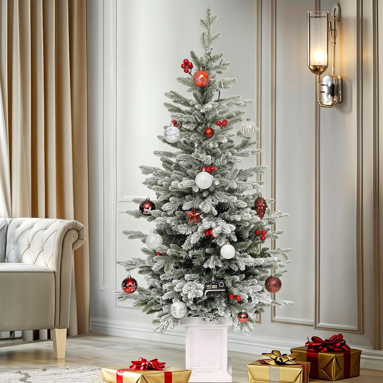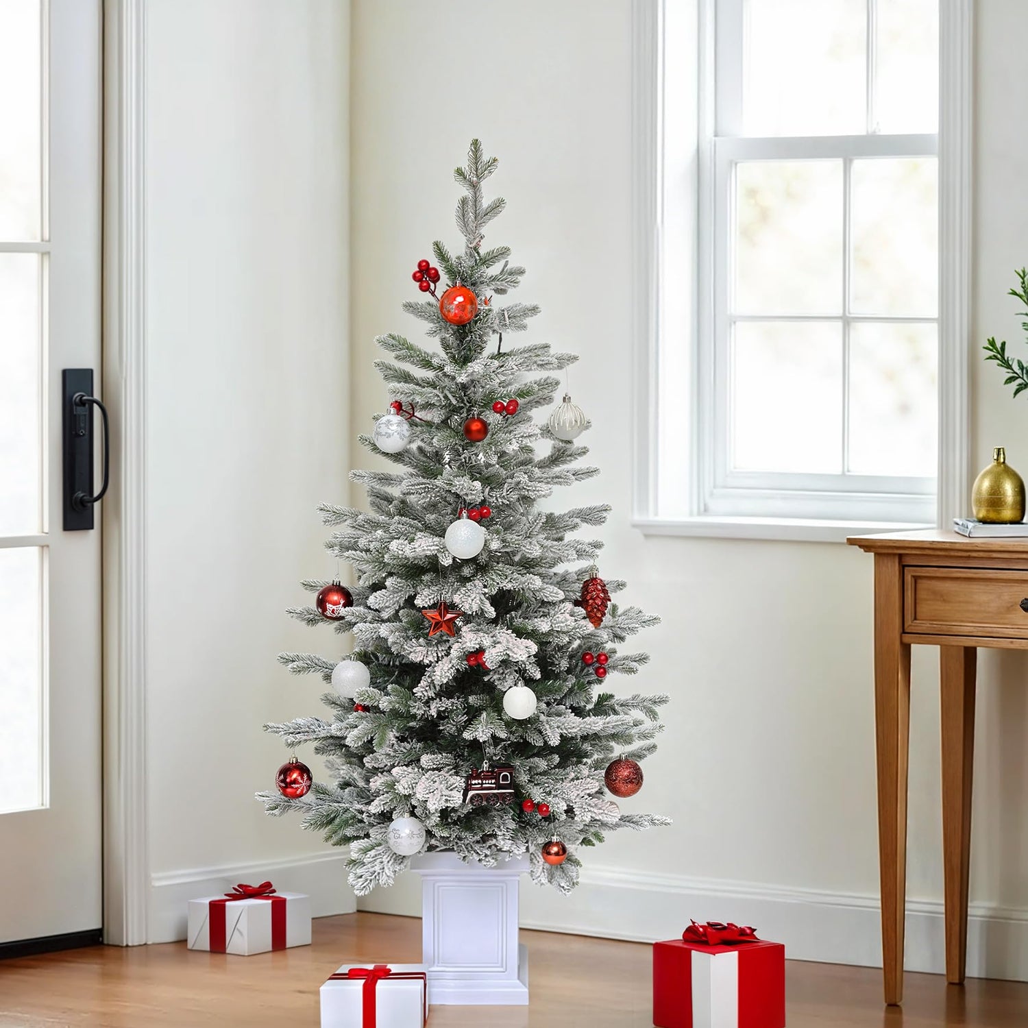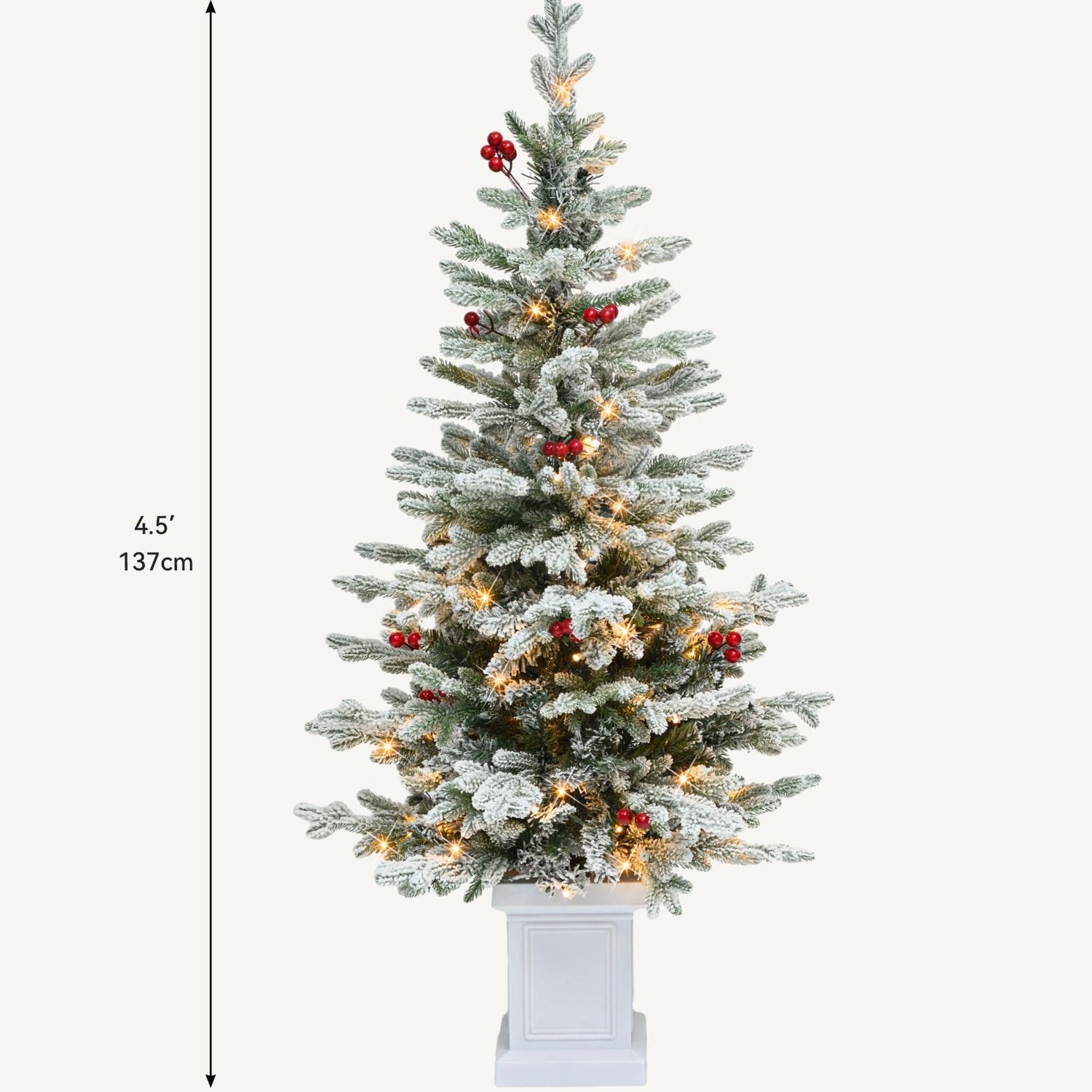 DWVO 4.5 FT Potted Slim Pre-lit Flocked Arctic Fir Pencil Tree, Potted Christmas Tree with 11 Red Hollies, 358 PE & PVC Branch Tips, and 100 Lights for Home and Office Decor