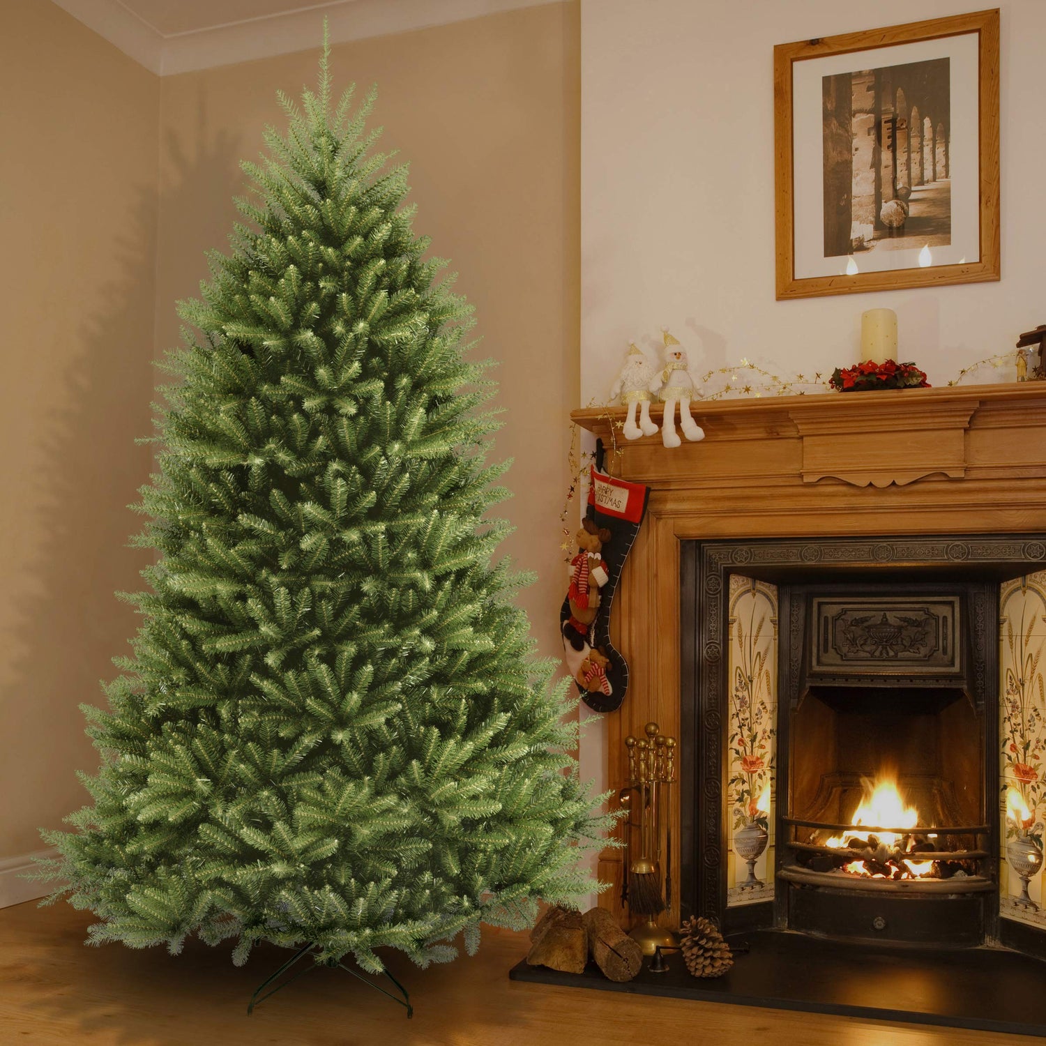 Details: Transform your home into a winter wonderland with National Tree Company's Artificial Christmas Tree. This majestic Dunhill Fir tree is 7.5 feet tall and 59 inches in diameter at the bottom, giving the tree a wide profile. Friends and family alike will marvel at how the tree closely mimics those outside. Made to look and feel lifelike, the stunning realism of the tree is defined by its close attention to detail, featuring hundreds of individually crafted branch tips that make up the wide, full-bodied branches that create space for your lights and ornaments. The tree is designed with a hinged branch system that allows the branches to swing down for a quick and simple set-up and fold back in for easy storage. Set aside 45-60 minutes after assembly to properly shape the tree by peeling back the branches and pulling the tips apart to give the branches a more full-bodied look. Once the tree is fluffed to your liking, weave your desired lights through the branches starting from the top and moving down towards the bottom. Before dressing the tree in twinkling lights and glistening ornaments, consider placing it in a living room or dining area where it can be viewed from multiple angles and does not block any entryways. Constructed with sturdy, high quality materials and hypo-allergenic, fire-resistant needles, this tree is built to bring holiday cheer for years to come. At National Tree Company, we strive to create high quality Christmas decorations to help you transform your home so you can keep making every holiday moment magical.