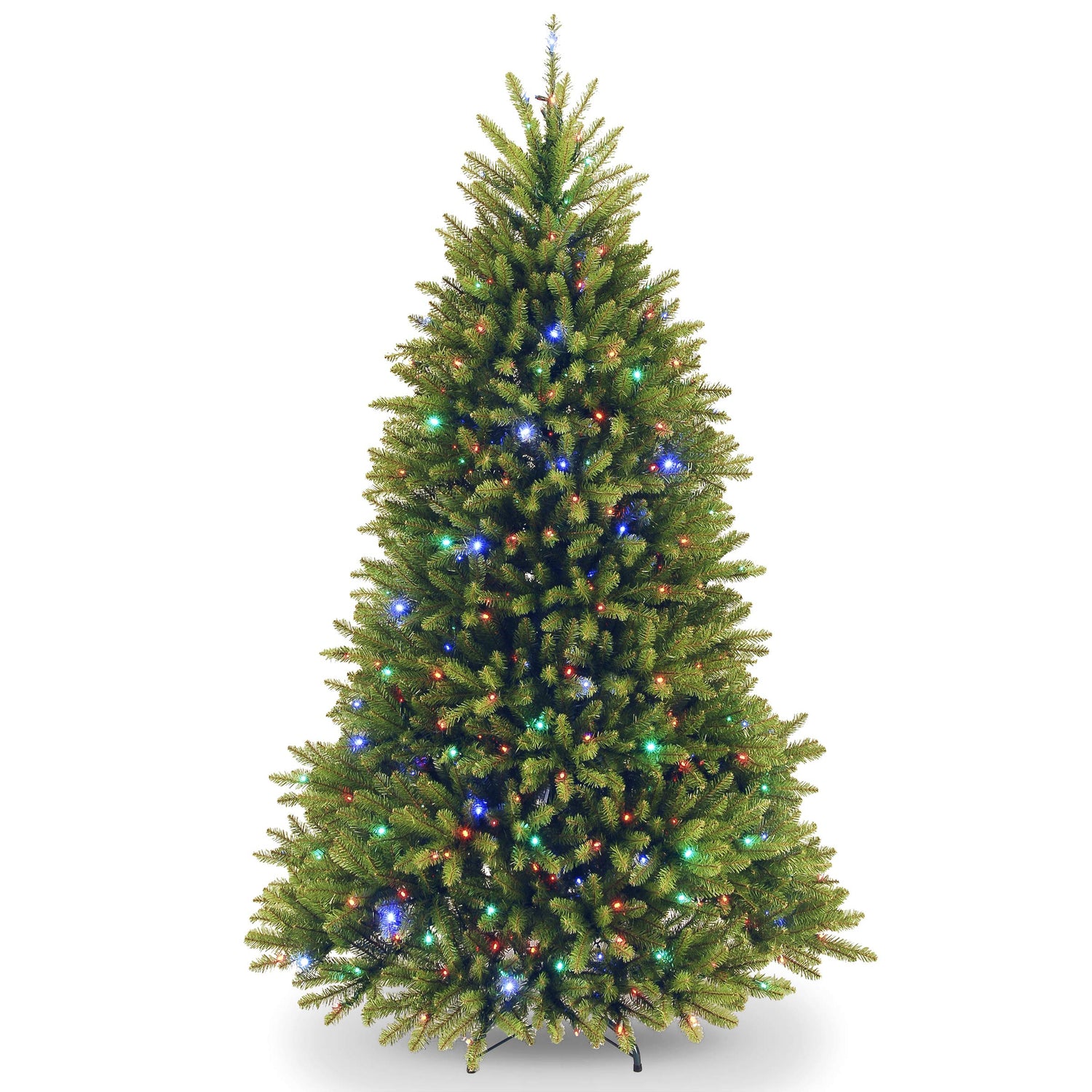 Details: Transform your home into a winter wonderland with National Tree Company's Pre-Lit Artificial Christmas Tree This majestic Dunhill Fir tree is 7.5 feet tall and 59 inches in diameter at the bottom, giving the tree a wide profile. Friends and family alike will marvel at how the tree closely mimics those outside. Made to look and feel lifelike, the stunning realism of the tree is defined by its close attention to detail, featuring hundreds of individually crafted branch tips that make up the wide, full-bodied branches that create space for your lights and ornaments. The tree is designed with a hinged branch system that allows the branches to swing down for a quick and simple set-up and fold back in for easy storage. Set aside 45-60 minutes after assembly to properly shape the tree by peeling back the branches and pulling the tips apart to give the branches a more full-bodied look. This fantastically festive tree is strung with 900 Dual Color LED lights prior to packaging and includes a sturdy, metal base for a more convenient setup. The Dual Color LED bulbs can alternate between white and multicolor lights and includes a switch to control ten different light functions, allowing the bulbs to twinkle, flash or fade on either color setting. The lights operate individually, so if the bulb lens has not been cracked or broken, the light set will continue to illuminate except for any individual bulbs that are not working. This tree also includes PowerConnect, an additional feature where the wires run through the middle pole of the tree, eliminating the need for extension cords and plugs in the branches. Before dressing the tree in twinkling lights and glistening ornaments, consider placing it in a living room or dining area where it can be viewed from multiple angles and does not block any entryways. Constructed with sturdy, high quality materials and hypo-allergenic, fire-resistant needles, this tree is built to bring holiday cheer for years to come. At National Tree Company, we strive to create high quality Christmas decorations to help you transform your home so you can keep making every holiday moment magical.