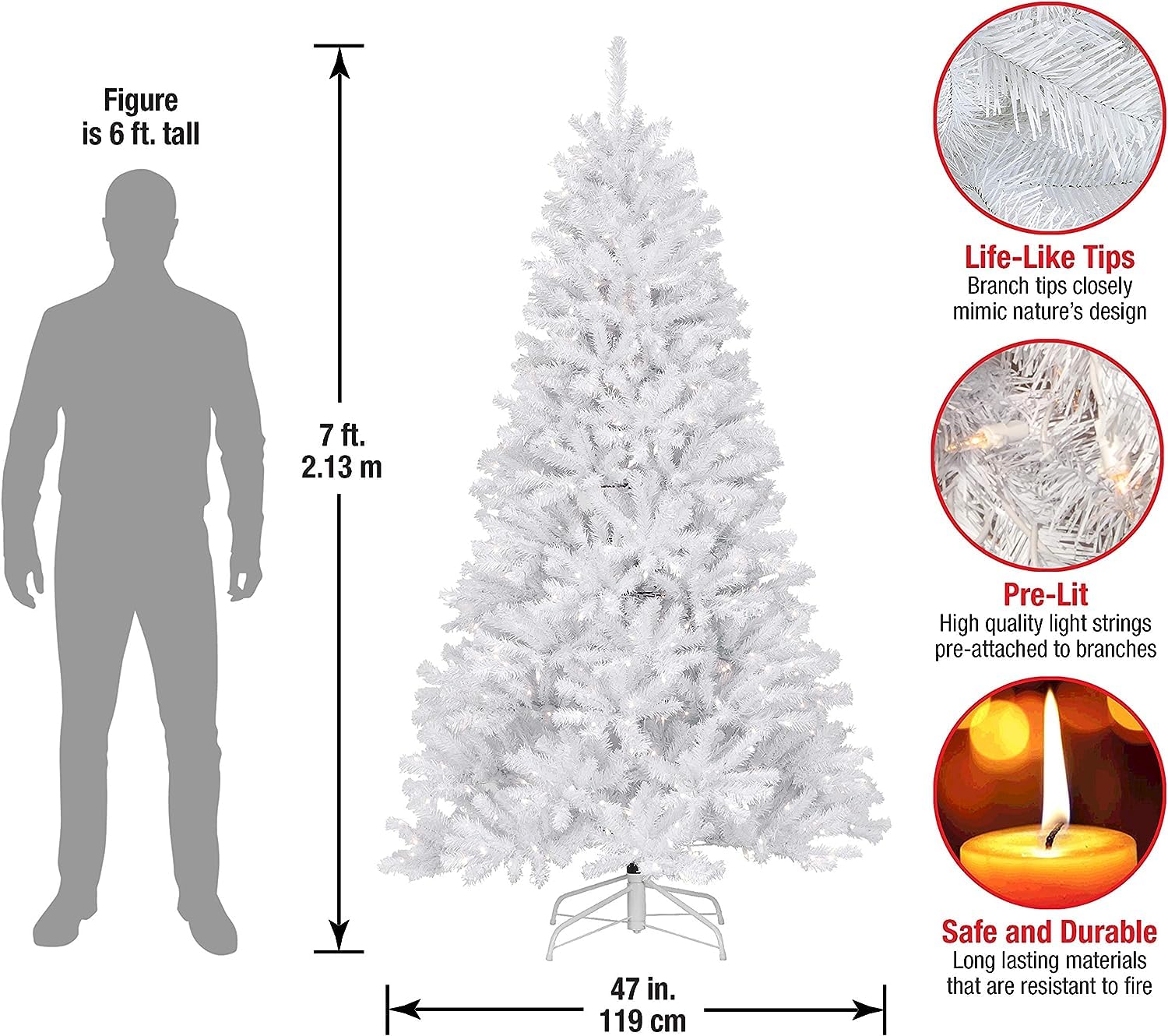 - This North Valley Spruce Full Pre-Lit Artificial White Christmas Tree is 7 feet tall with a 47 inch base diameter. Featuring hundreds of individually crafted branch tips to create full bodied branches, this tree is designed to look and feel lifelike.