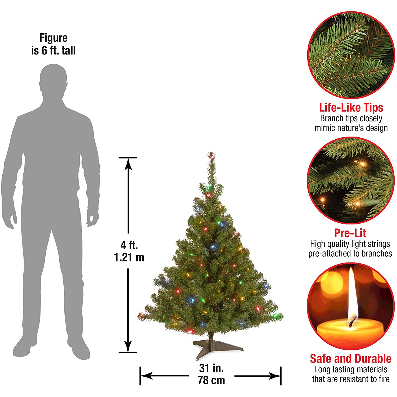 Details: Transform your home into a winter wonderland with National Tree Company's Pre-Lit Artificial Christmas Tree. This majestic Kincaid Spruce tree is 4 feet tall and 31 inches in diameter at the bottom, giving the tree a wide profile. Friends and family alike will marvel at how the tree closely mimics those outside. Made to look and feel lifelike, the stunning realism of the tree is defined by its close attention to detail, featuring hundreds of individually crafted branch tips that make up the wide, full-bodied branches that create space for your lights and ornaments. The tree is designed with a hinged branch system that allows the branches to swing down for a quick and simple set-up and fold back in for easy storage. Set aside 45-60 minutes after assembly to properly shape the tree by peeling back the branches and pulling the tips apart to give the branches a more full-bodied look. This fantastically festive tree is strung with 100 multicolor UL lights prior to packaging and includes a sturdy, metal base for a more convenient setup. The lights operate individually, so if the bulb lens has not been cracked or broken, the light set will continue to illuminate except for any individual bulbs that are not working. Before dressing the tree in twinkling lights and glistening ornaments, consider placing it in a living room or dining area where it can be viewed from multiple angles and does not block any entryways. Constructed with sturdy, high quality materials and hypo-allergenic, fire-resistant needles, this tree is built to bring holiday cheer for years to come. At National Tree Company, we strive to create high quality Christmas decorations to help you transform your home so you can keep making every holiday moment magical.