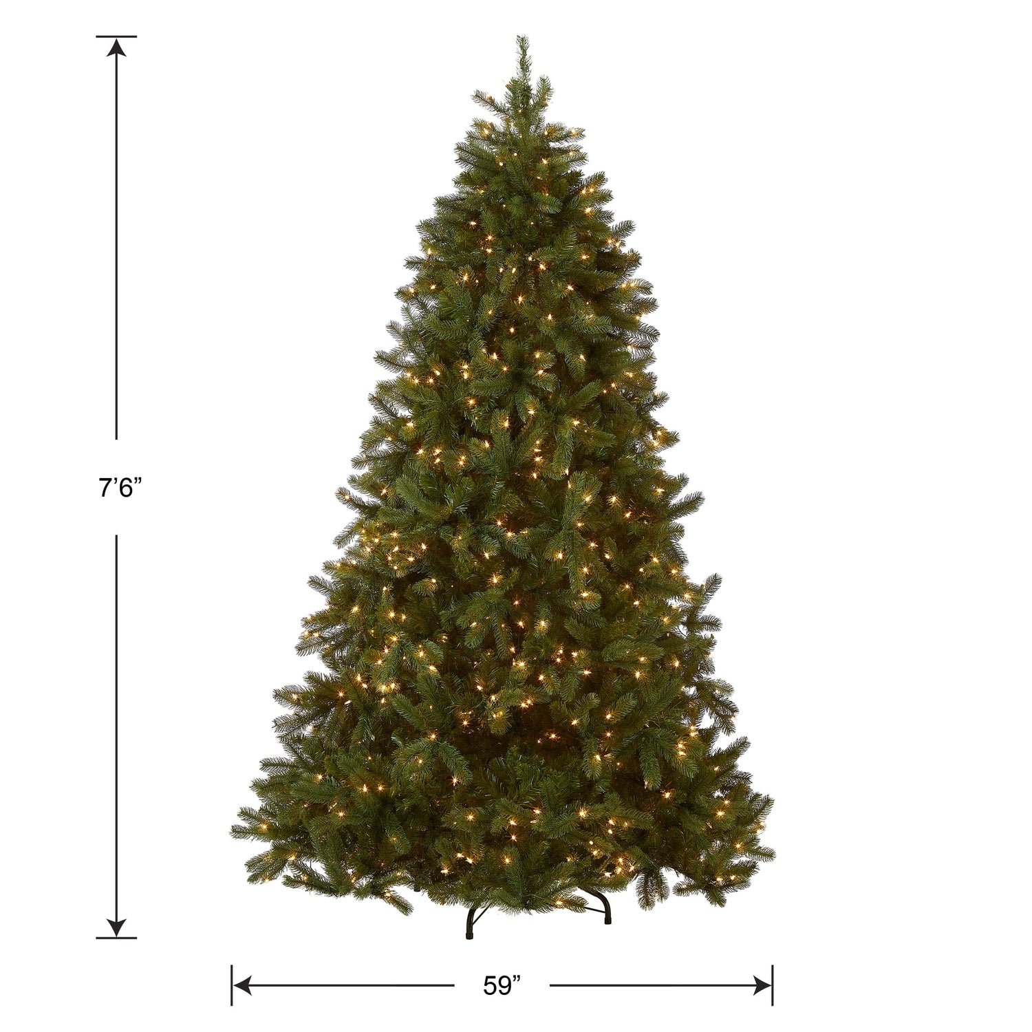 - This Downswept Douglas Fir Full Pre-Lit Artificial Green Christmas Tree is 7.5 feet tall with a 59 inch base diameter. Featuring hundreds of 'Feel Real' individually crafted branch tips to create full bodied branches, this tree is designed to look and feel lifelike.
