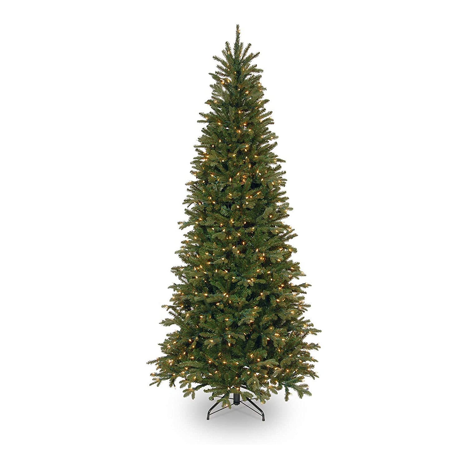 • This Tiffany Fir Slim Pre-Lit Artificial Green Christmas Tree is 7.5 feet tall with a 44 inch base diameter. Featuring hundreds of 'Feel Real' individually crafted branch tips to create full bodied branches, this tree is designed to look and feel lifelike.