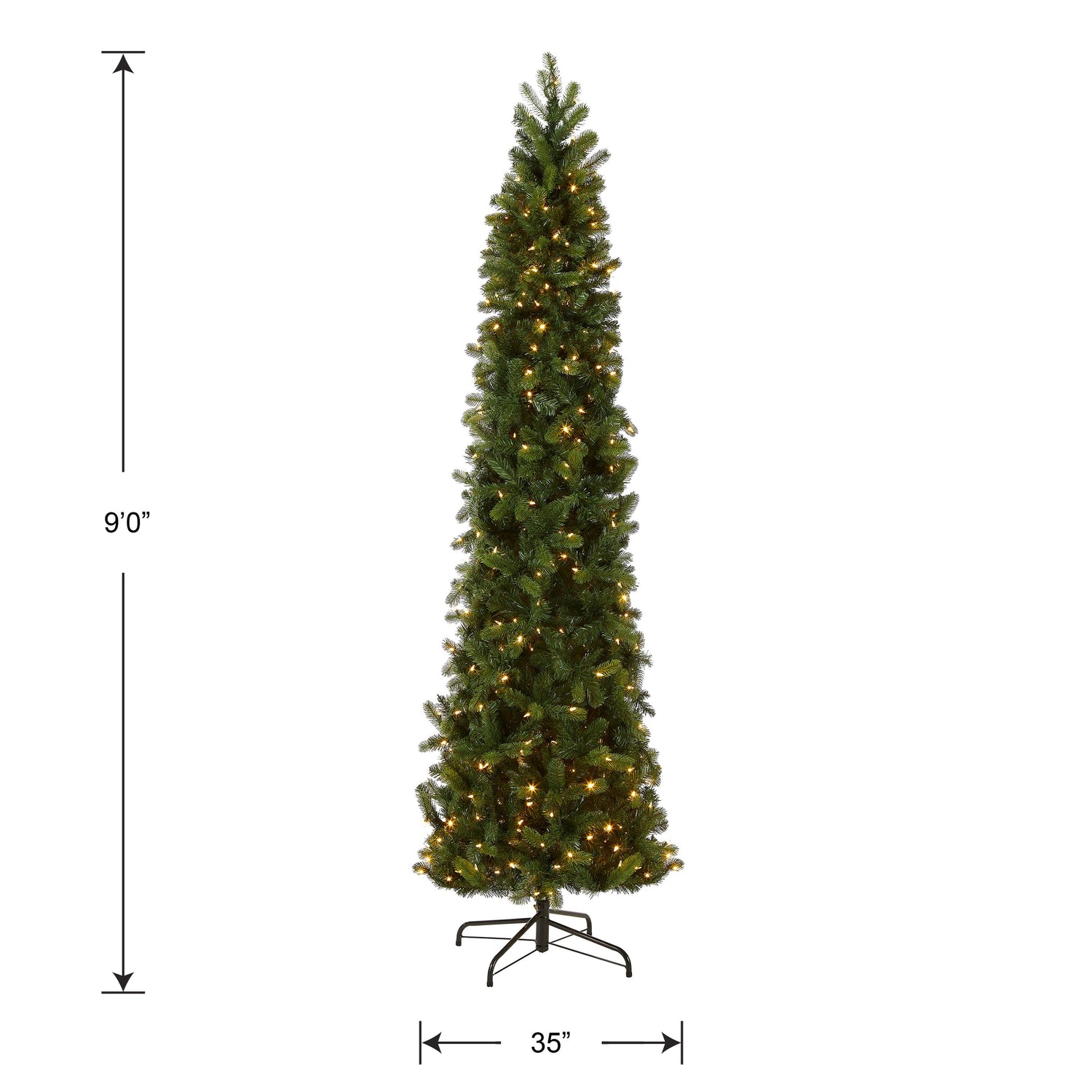 - This Downswept Douglas Fir Slim Pre-Lit Artificial Green Christmas Tree is 9 feet tall with a 35 inch base diameter. Featuring hundreds of 'Feel Real' individually crafted branch tips to create full bodied branches, this tree is designed to look and feel lifelike.