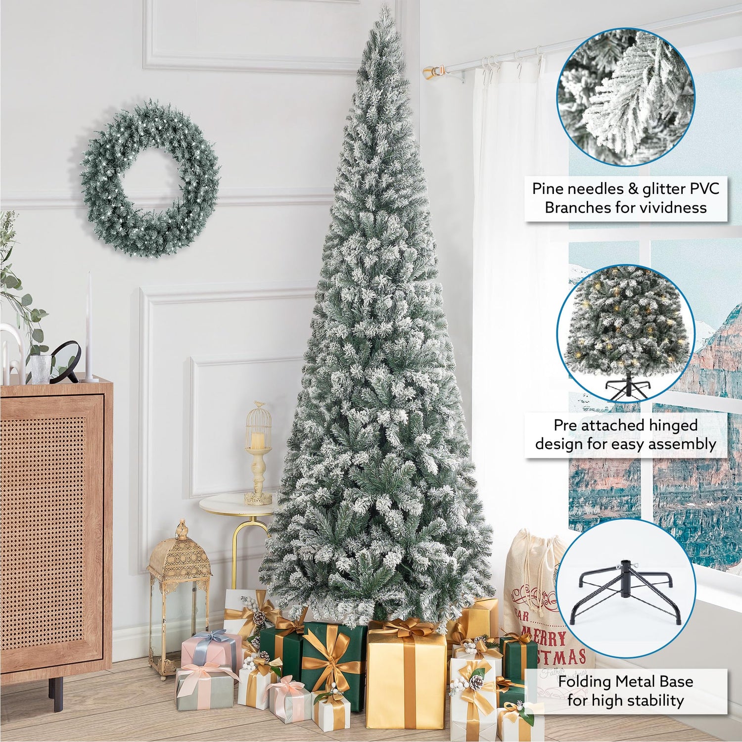 Salzburg 9ft Frosted Prelit Slim Artificial Christmas Tree with 1455 Branch Tips, 500 Warm Lights and Metal Stand, 37" Wide Realistic Snow Flocked Skinny Pencil Christmas Tree by Naomi Home
