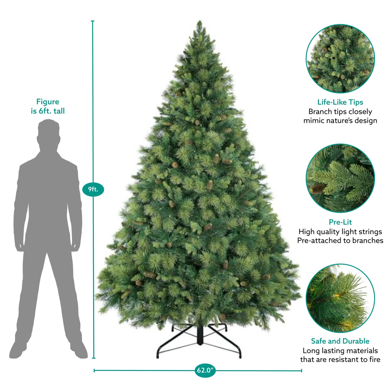 Vail 9ft Prelit Artificial Christmas Tree with Pine Cones, Foot Pedal, 2294 Branch Tips, 1050 Warm Lights and Metal Stand, 62" Wide Realistic Traditional Christmas Tree with Lights by Naomi Home
