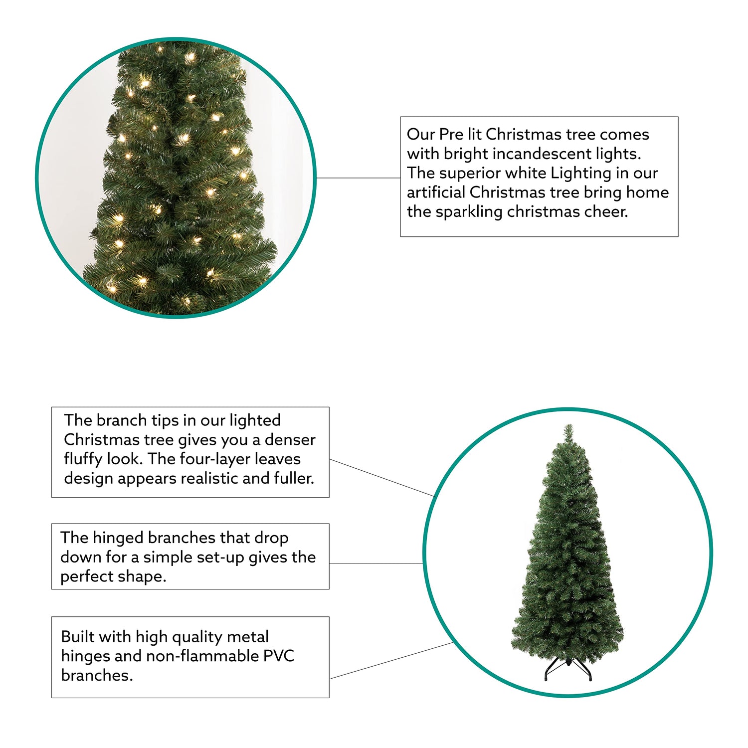 - COMES PRE-LIT TO SAVE YOU TIME : The Skinny Christmas Tree with Lights comes Pre-lit with 500 incandescent lights that make setting up your tree a breeze. These lights emit a warm glow that highlights your decorations and holiday gifts making your place extra-special. Naomi Home Christmas Trees with Lights always stand for trust and quality.