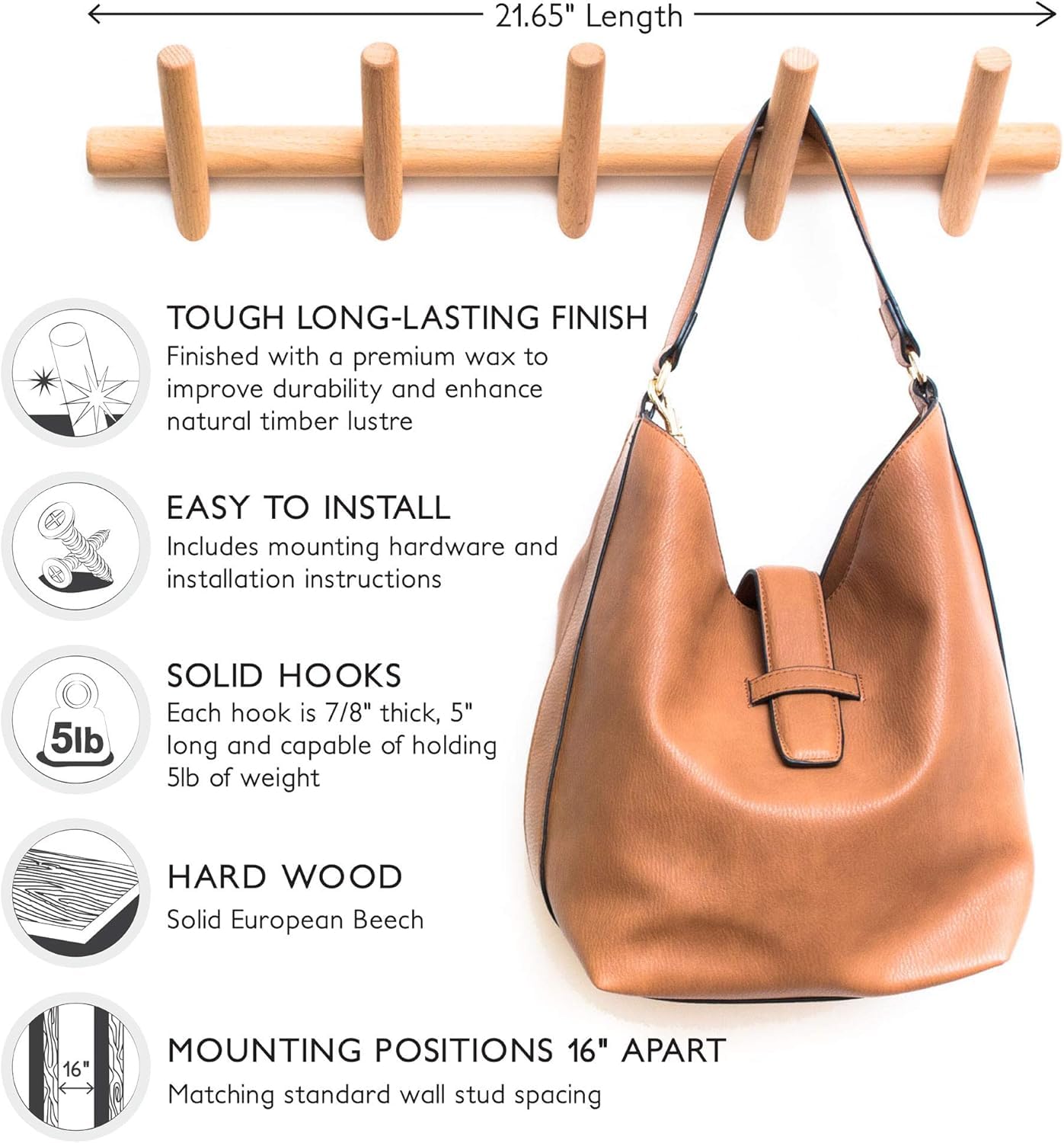- STUNNING CRAFTSMANSHIP: Our mounted coat organizers are comprised of natural timber beechwood with a wax finish to really highlight the natural colors of the hardwood, creating a lustre finish and protective coat. The multiple accents of brown give this stylish coat hanger depth and texture, providing a farmhouse, cabin-like motif. This makes it just as attractive and complimentary in a bathroom as it does a mud room.