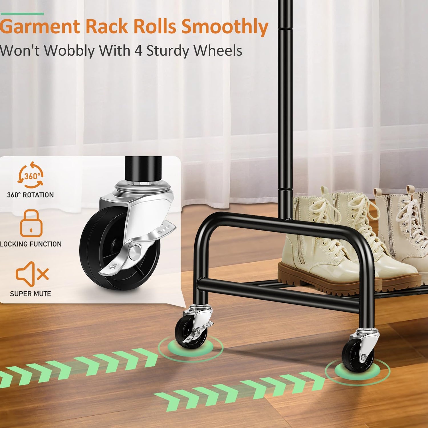 - 【Convenient to Move & Lock】Our cloth rack has 4 heavy duty omnidirectional casters make it easy to move the clothing rack to different rooms, the portable clothes rack easy to roll even fully loaded with clothes, for added convenience, also 2 of the wheels can be locked in place to keep the clothes hanging rack stand stationary, guarantee the safety of your family.