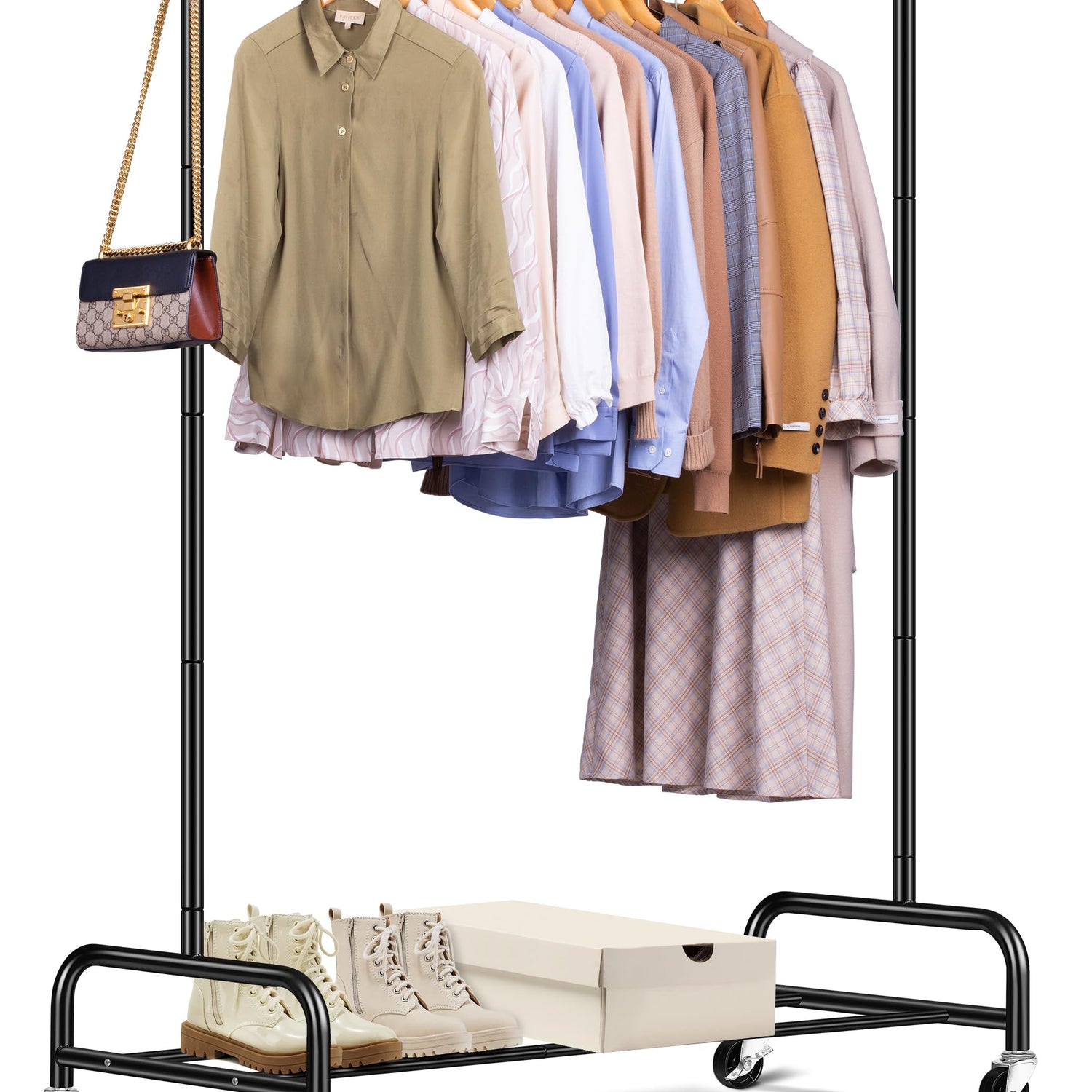 - 【Higher Dress Rack】The height of the closet rack is 63" from the top to the rack base (not to the wheels), rolling coat rack has enough space to accommodates short and long garment, shirts, pants sweaters, jackets, even long skirts, dress, trench, etc; You can install clothes racks for hanging clothes in half an hour to use parts and detailed instructions in the package, so you can quickly have more space to tidy up your clothes.