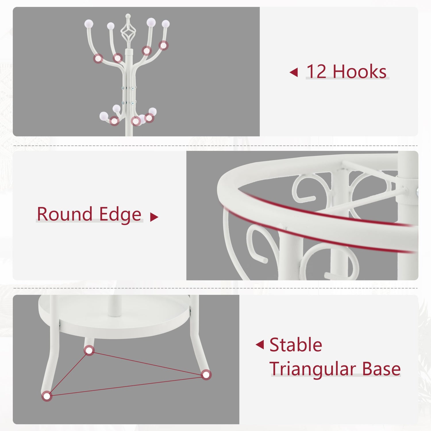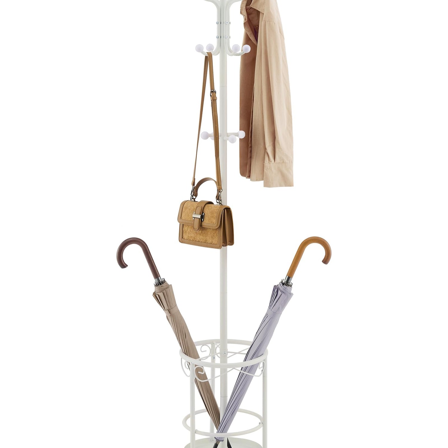 • Maximize Space with Vertical Storage: with 12 hooks available, this standing coat rack provides ample space to hang coats, hats, scarves, and even bags at once. And the umbrella holder with the plate at the base is designed to keeps umbrella in an upright position and prevent any messy drips