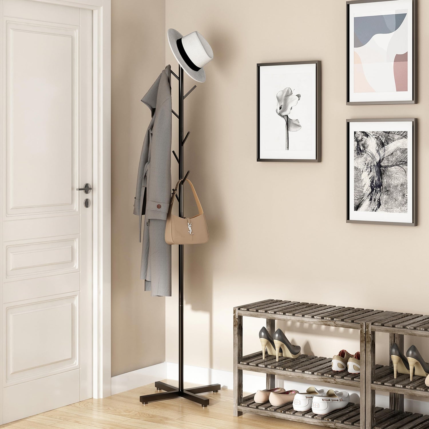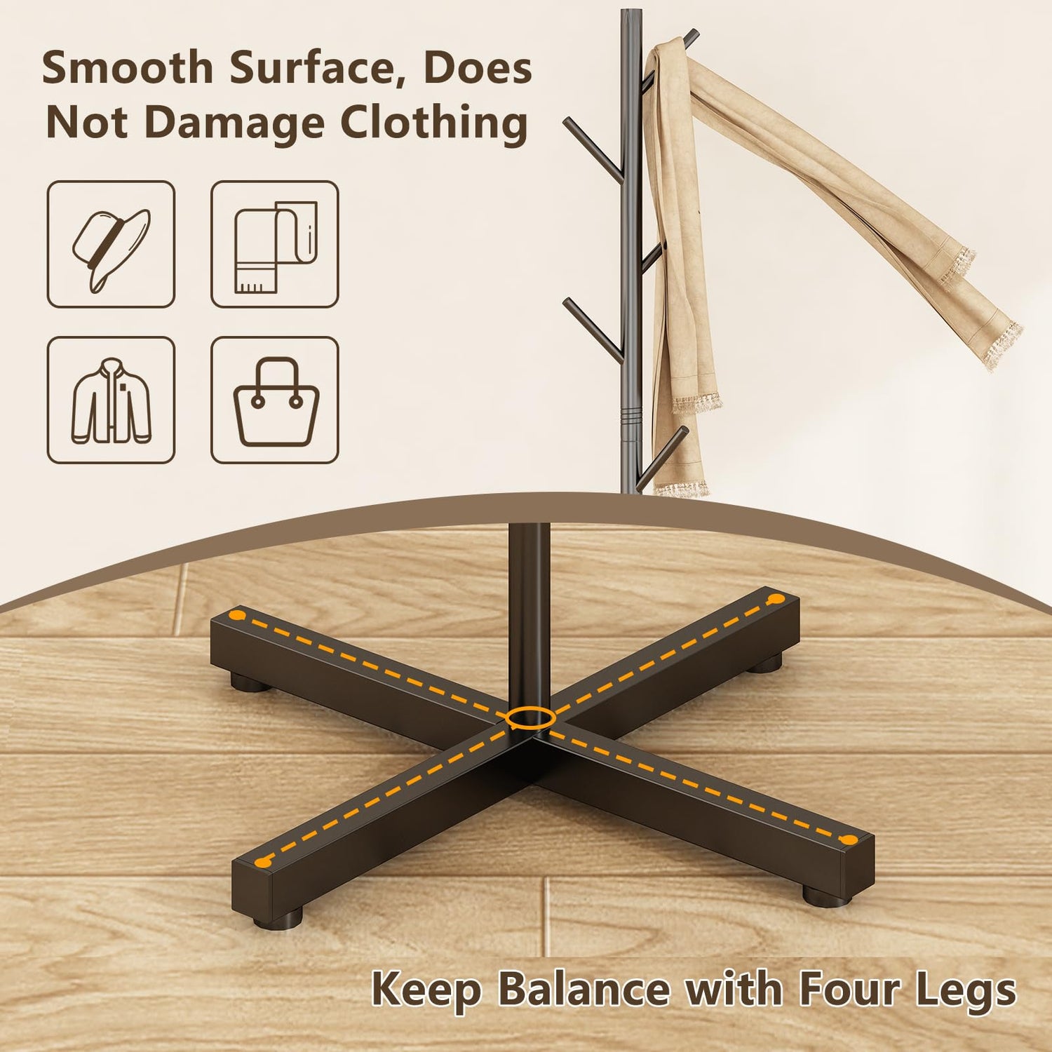 • FREESTANDING COAT RACK: 8 hooks are designed to hang your coats, jackets, scarves, handbags, purses, and hats on this coat tree, solving the problem of home clutter and making it easy to find frequently used items.