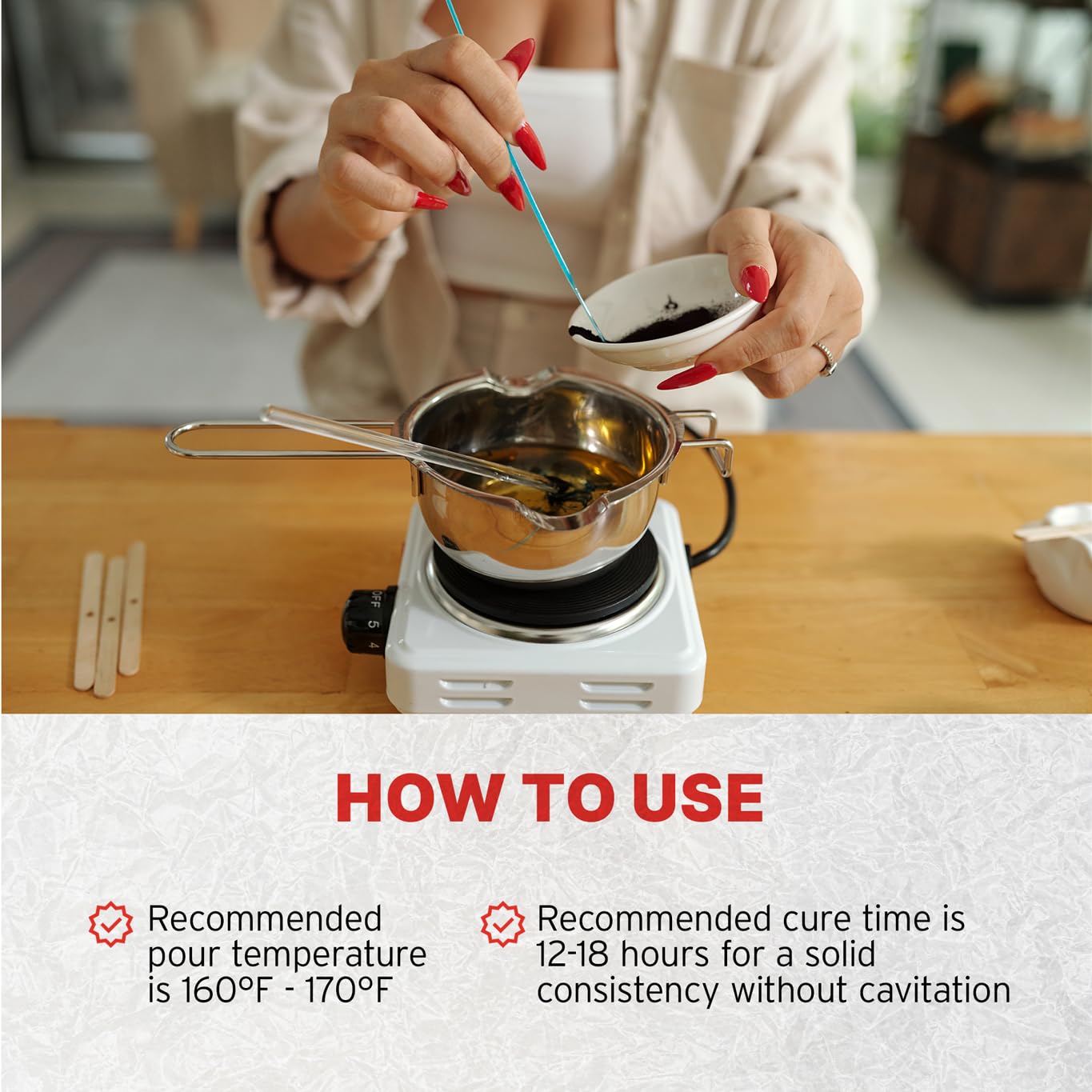 - How to Use: The coconut apricot candle waxes recommended pour temperature is 160°F-170°F; Fragrance addition is 7%-9%, while the recommended cure time is 12-18 hours for a solid consistency without cavitation