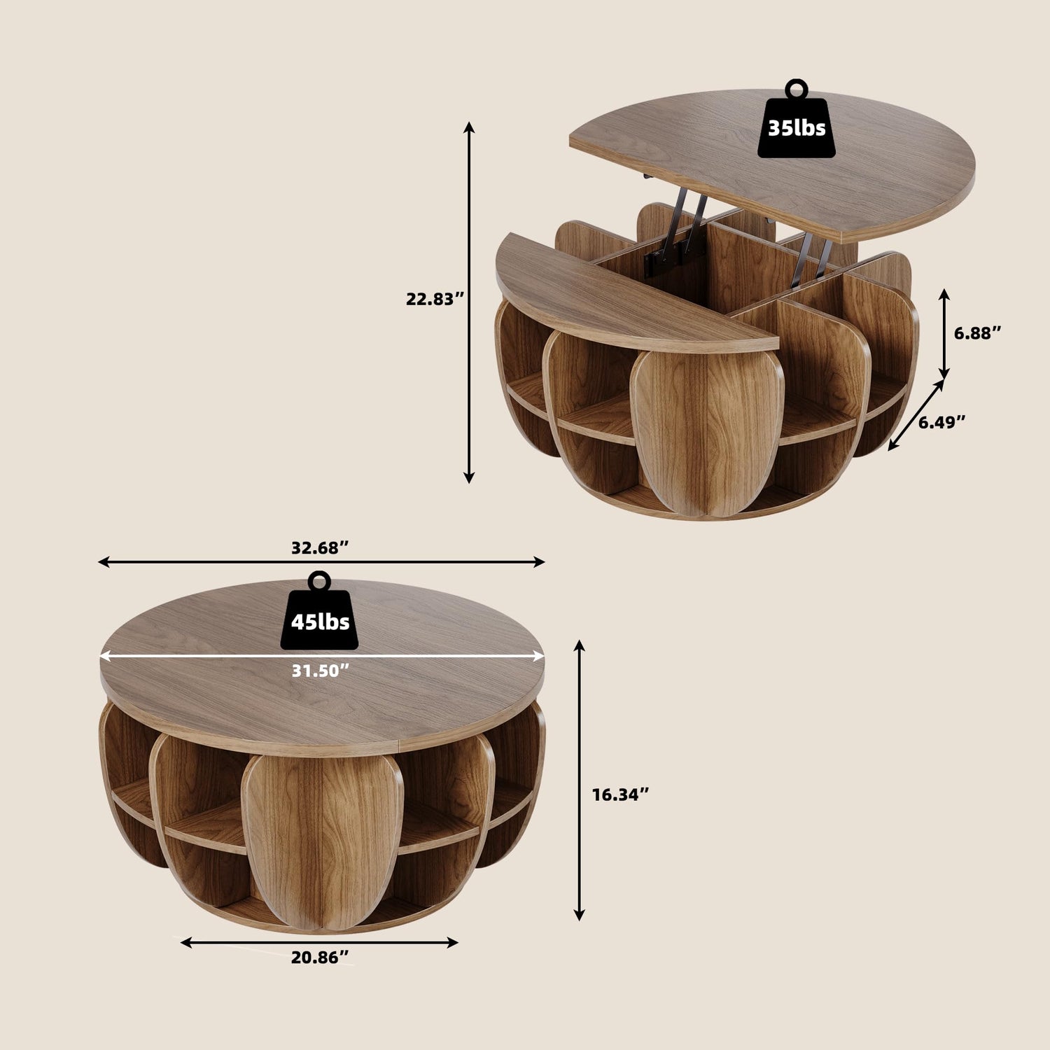 - 【Large Storage Space】 This round coffee table has a large hidden storage compartment under the lifting platform, which is spacious enough to store blankets, books, toys, snacks and any items that need to be hidden or stored, keeping them away from dust and keeping your living room tidy and clean. And multi open compartments beneath the tabletop are enough to store items like books, game controllers, keeping them handy. In addition , the top surface space of 32.7" x 32.7" is spacious enough to display decorative ornaments, vases, laptops, etc