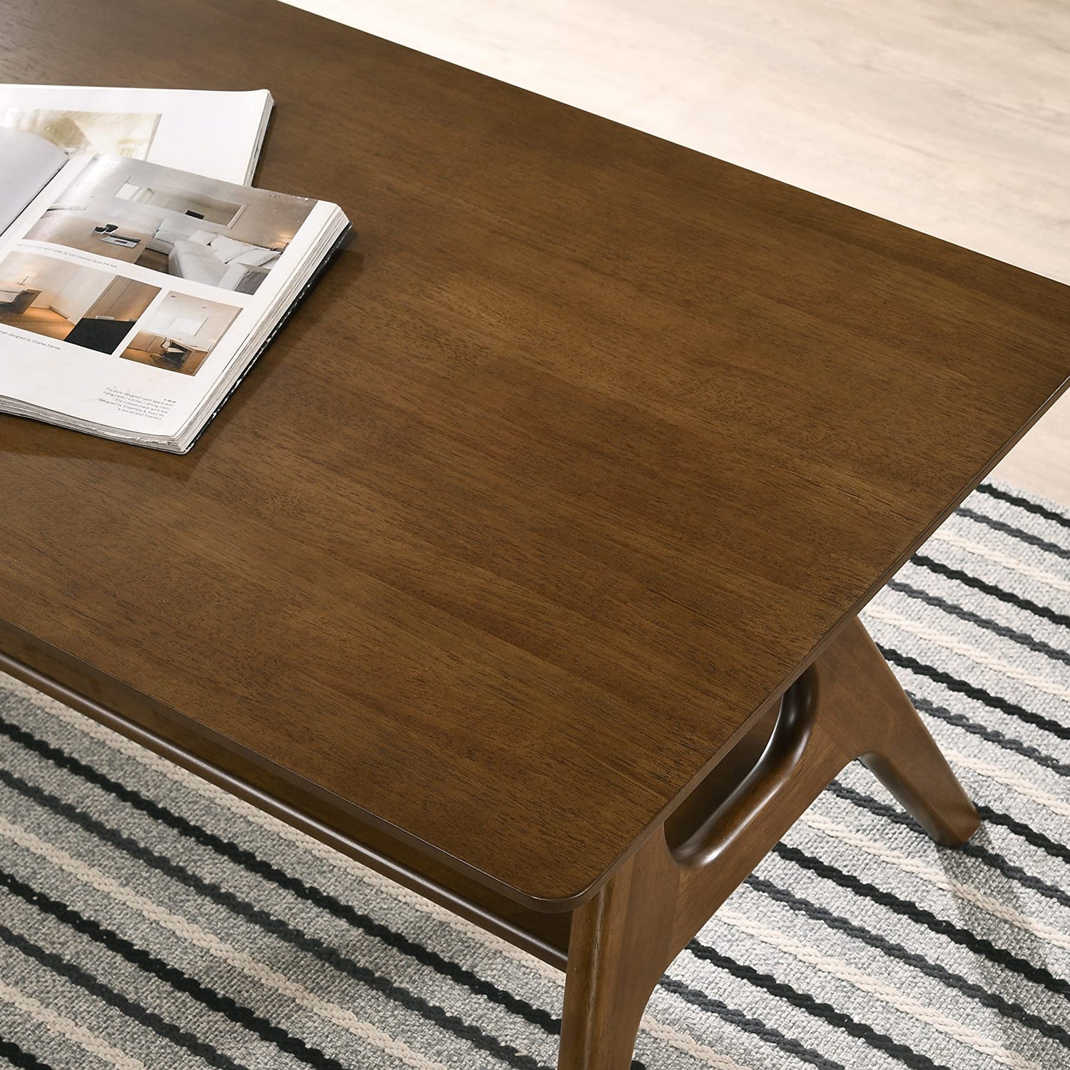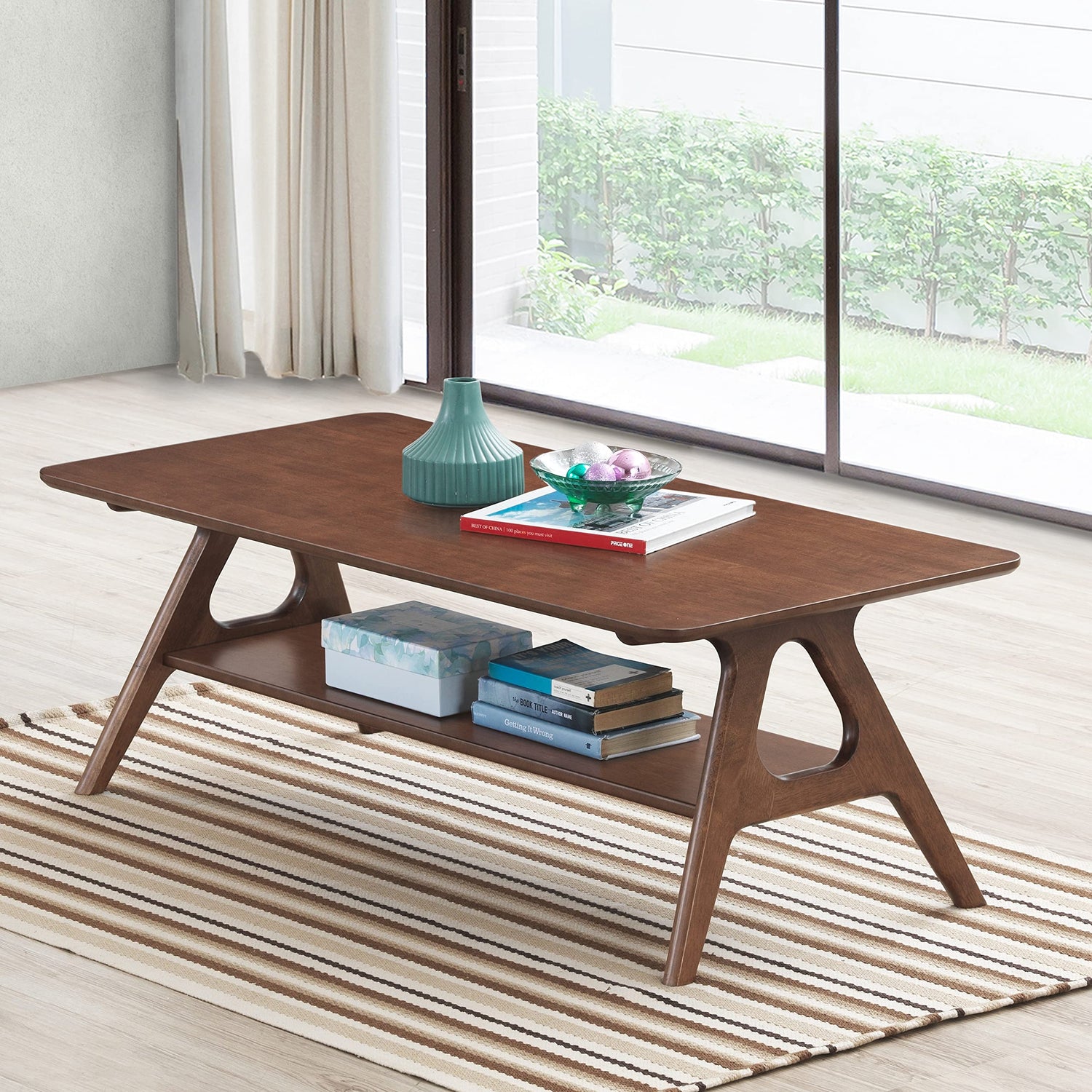 Details: The Arona Mid-Century Modern Wood Coffee Table offers both versatility and functionality. Constructed out of solid rubberwood with a rich walnut finish, the Arona table is at once decorative and functional. The open-style concept offers space for storage. This table perfectly captures the elegant shape and angles that make mid-century modern design so desirable.