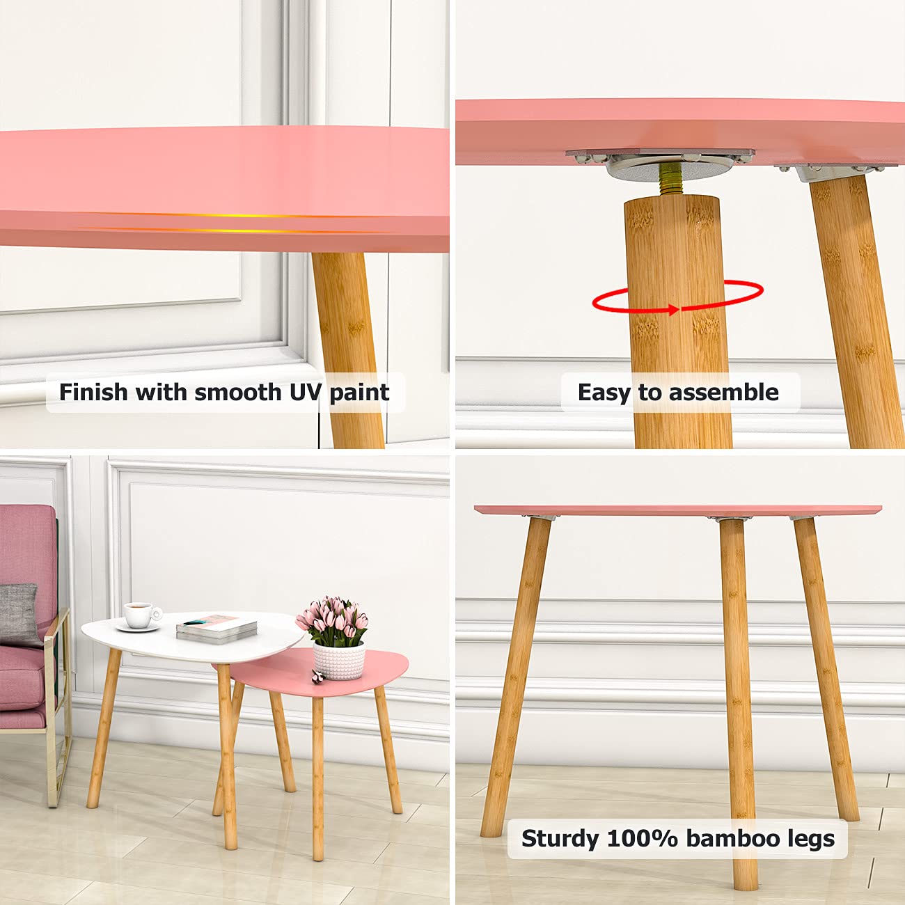 Bambloom Bamboo Nesting Coffee Tables - Small Coffee Table for Living Room, Set of 2 Triangle End Table Modern Side Table for Bedroom Apartment Balcony Yard Small Spaces, (White & Pink)