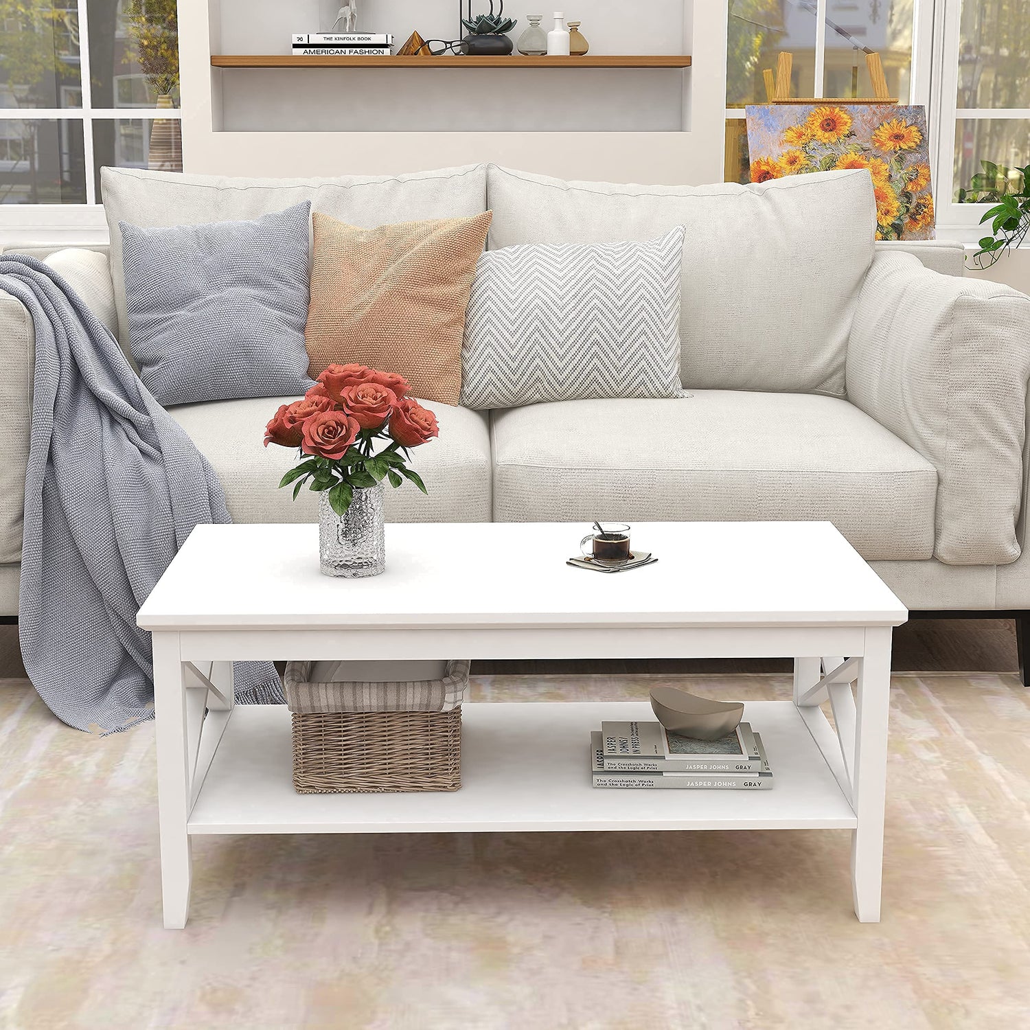 ChooChoo White Coffee Table Classic X Design for Living Room, Rectangular Modern Cocktail Table with Storage Shelf, 39 Inch