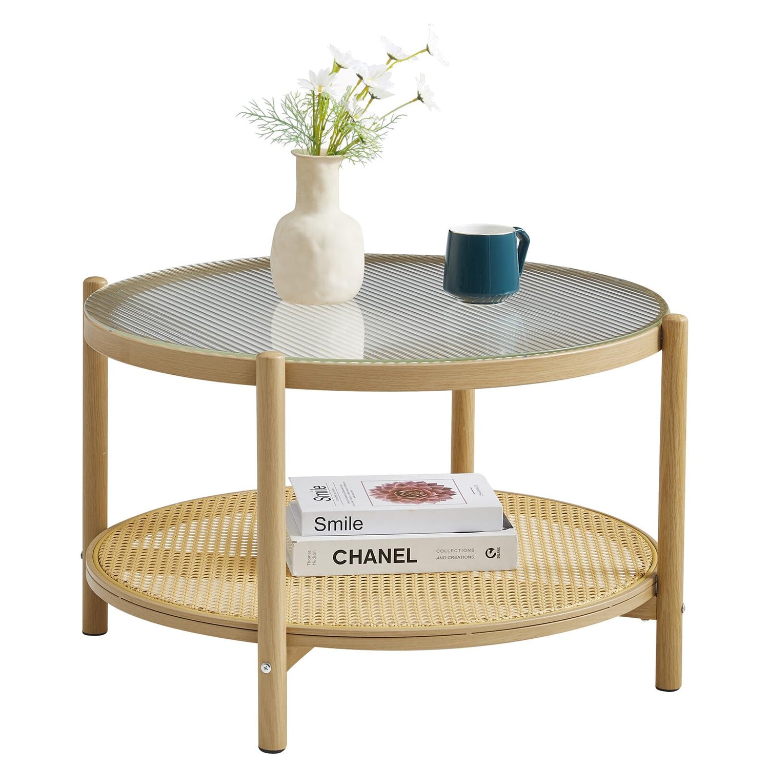 • Stylish Design Rattan Coffee Table: Clean lines and a glam finish give this circular coffee table a sleek, elegant look; The rattan shelf creates nature beauty; Up top, it is tempered glass tabletop with stylish water wave design, the glass could be placed either side on top as per your preference