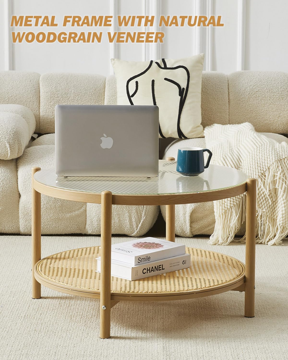 COSVALVE 27.5" Boho Rattan Coffee Table, Round Glass Metal Center Table, Modern Simple 2 Tier Middle Table for Small Space Living Room Bedroom Office Meeting Room