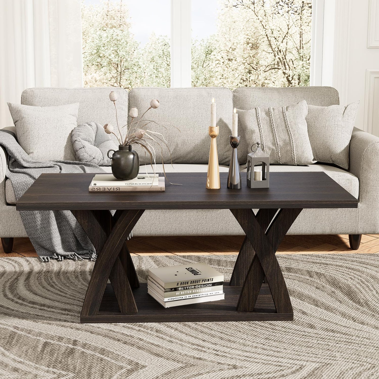 - 【Coffee Table】This rectangular coffee table for living room is very simple and generous. The coordinated colors and X-shaped base design highlight its high quality and fashion. Suitable for different living styles, it can be used as a modern accent or complement traditional style furniture. Its size and double-layer storage design are just right for families with different space needs. It is a beautiful, practical and stylish piece of furniture.