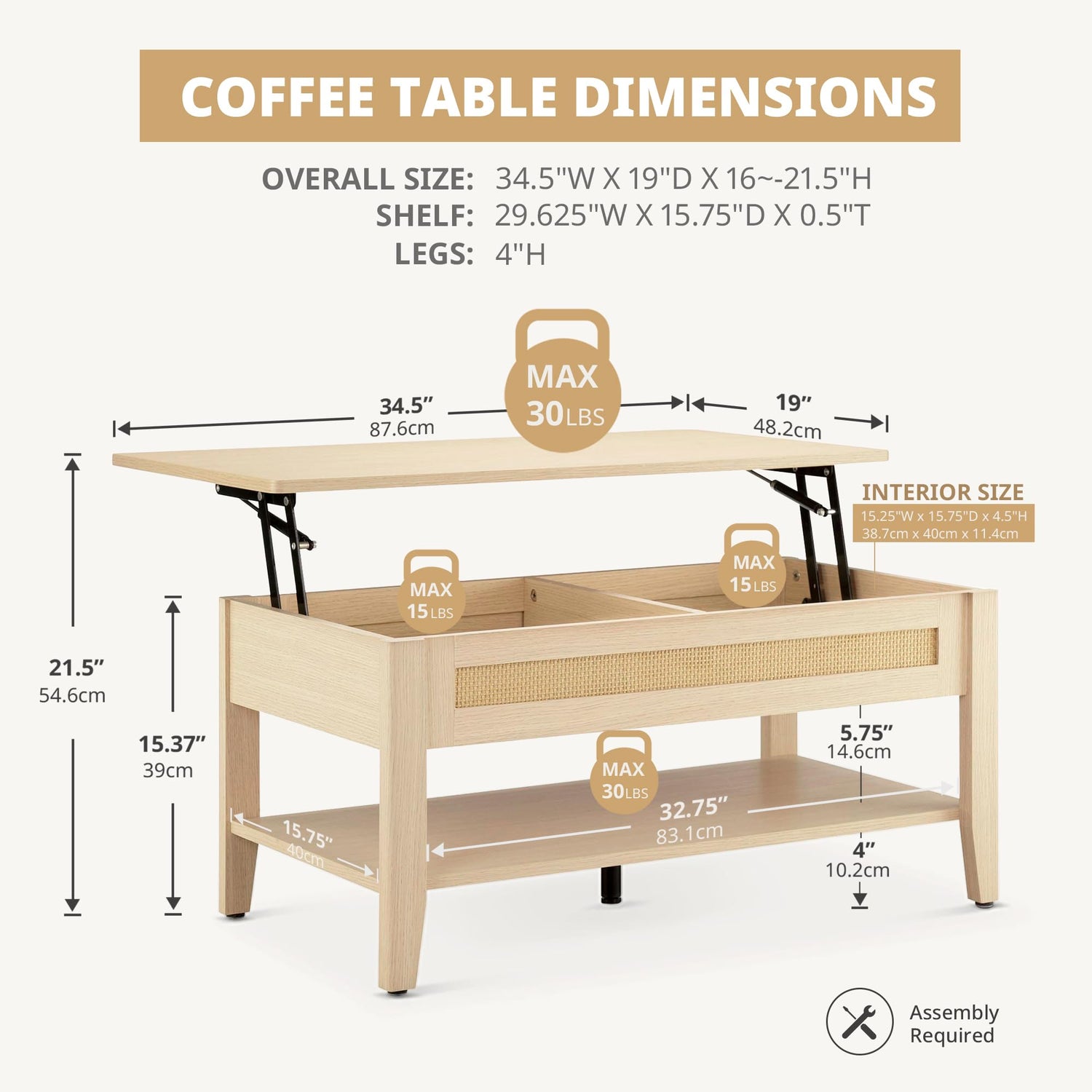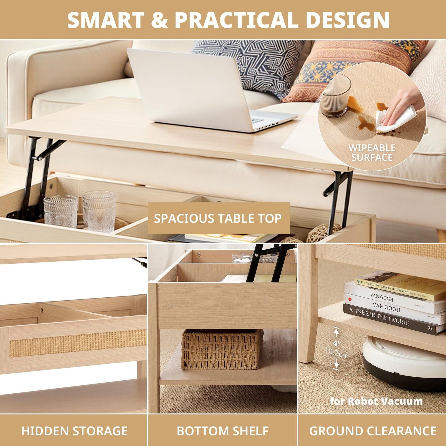 Ink+Ivy Wood Lift Top Coffee Table with Hidden Compartment and Large Storage Shelf, Boho Modern Rattan Dining Rectangle Center Table for Home Living Room Office, 34.5" W, Natural
