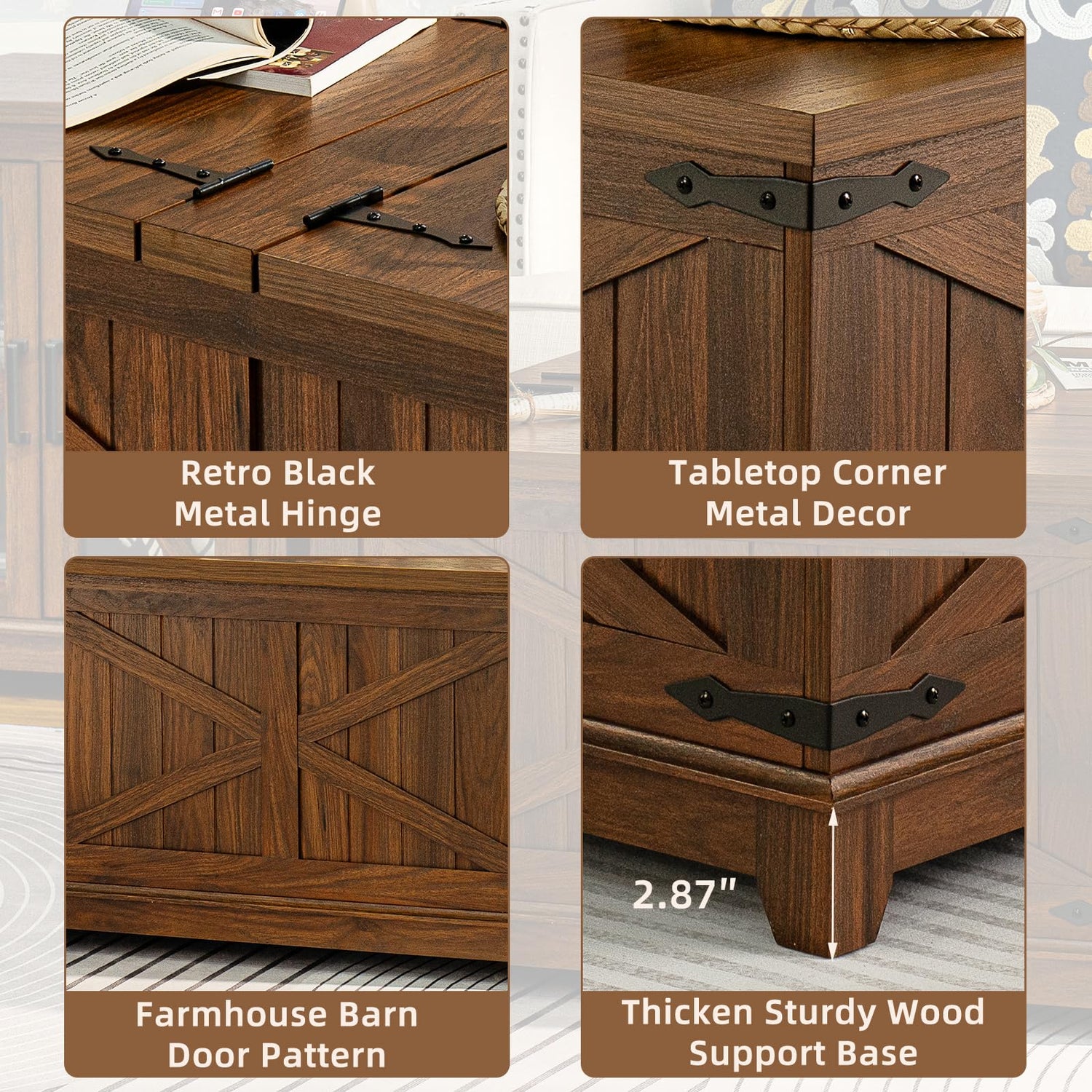 • [Classic Farmhouse Style] The country coffee table features a simple square design with a unique fence, "X" pattern, black vintage metal decorative pieces, which is a perfect blend of modern style and rustic farm house style. The coffee table's wood grain finish also adds a touch of nature. This farmhouse cocktail coffee table goes well with any living room furniture and décor, not only is it practical and functional, but it also adds to the beauty of the room and shows off your personal taste.