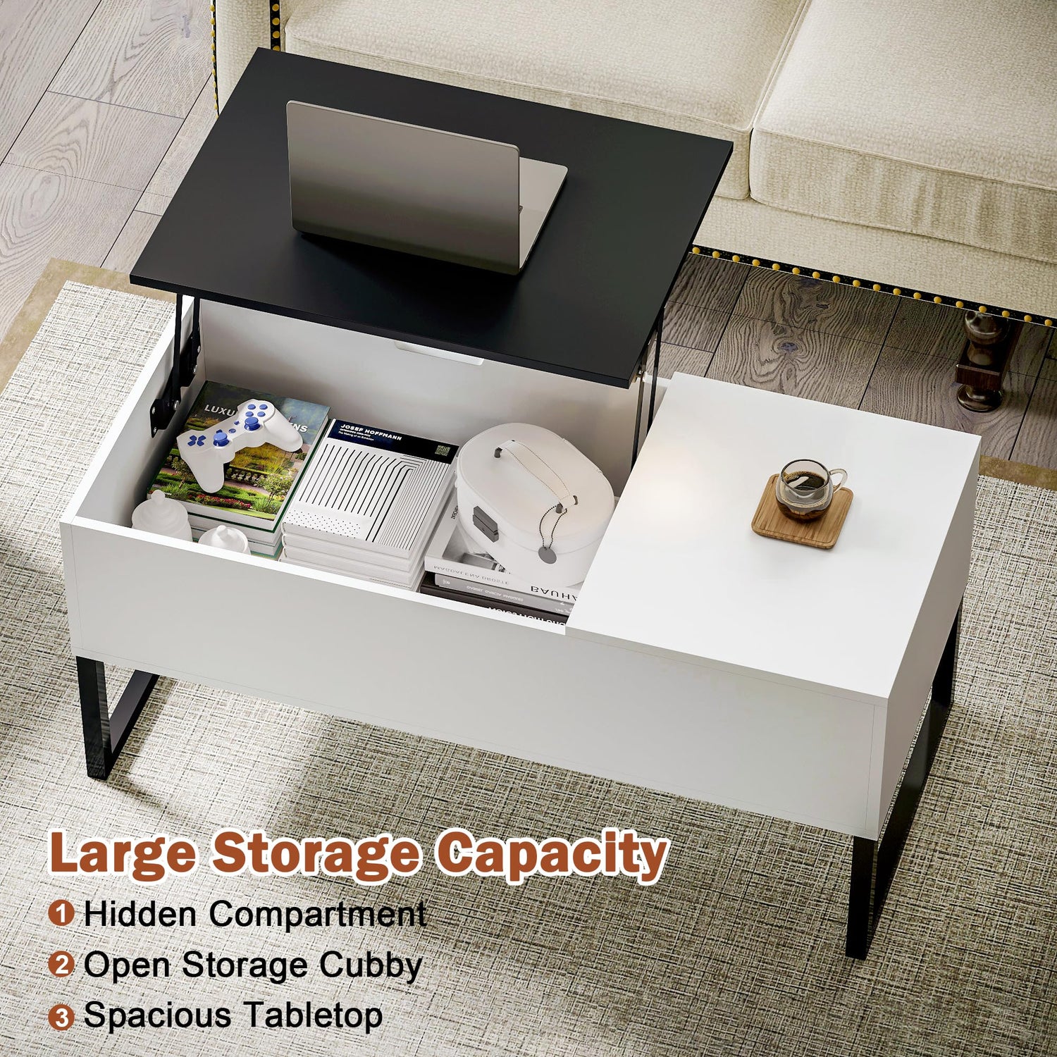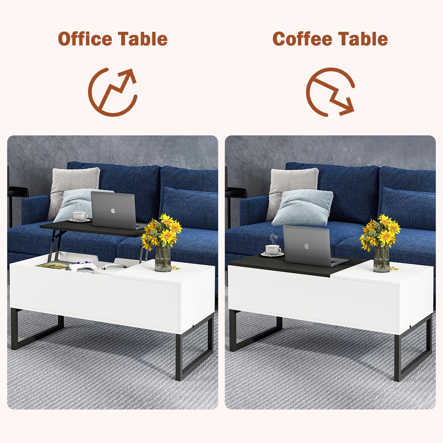• Lift-top Design: Our lift top coffee table with storage features an upgraded metal lifting mechanism, effortlessly raising the top without hand strain. Transform it into a temporary office, study, or dining space with ease