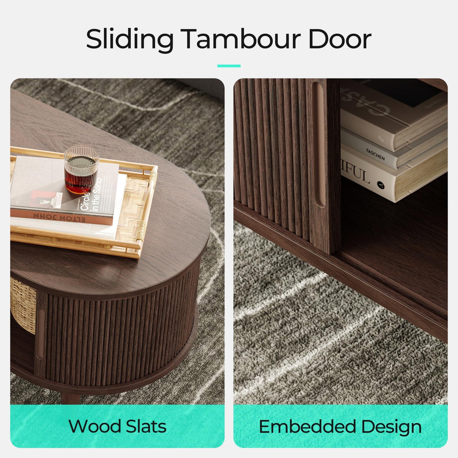 - Fluted Tambour Sliding Door - The fluted tambour door is a distinctive curved shape and slides smoothly, making this oval wood coffee table provides convenient access to all your necessities while bringing a touch of mid-century modern style sophistication to your home.