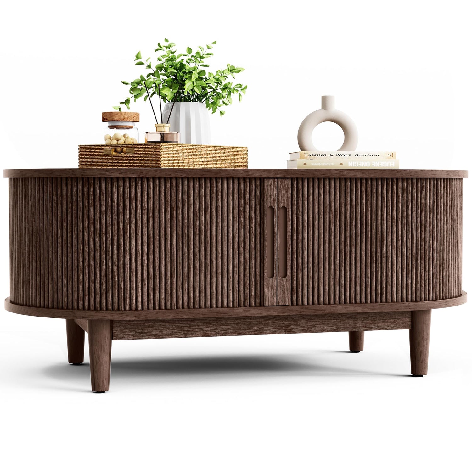 LINSY HOME Oval Coffee Table, Wood Coffee Table with Storage, Fluted Accent Center Table with Sliding Tambour Door, 39" Mid Century Modern Coffee Tables for Living Room, Bedroom, Apartment, Walnut