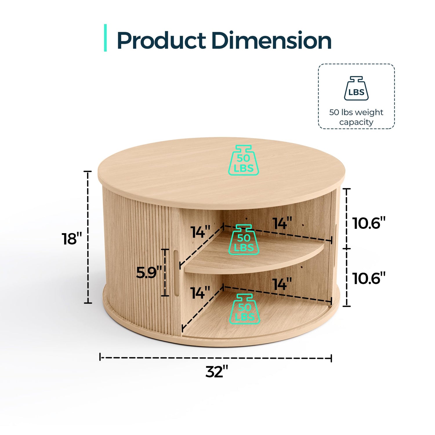 LINSY HOME Round Coffee Table, 31.5" Drum Coffee Table with Sliding Tambour Door, Fluted Accent Center Table with Storage, Mid Century Modern Coffee Table for Living Room, Oak