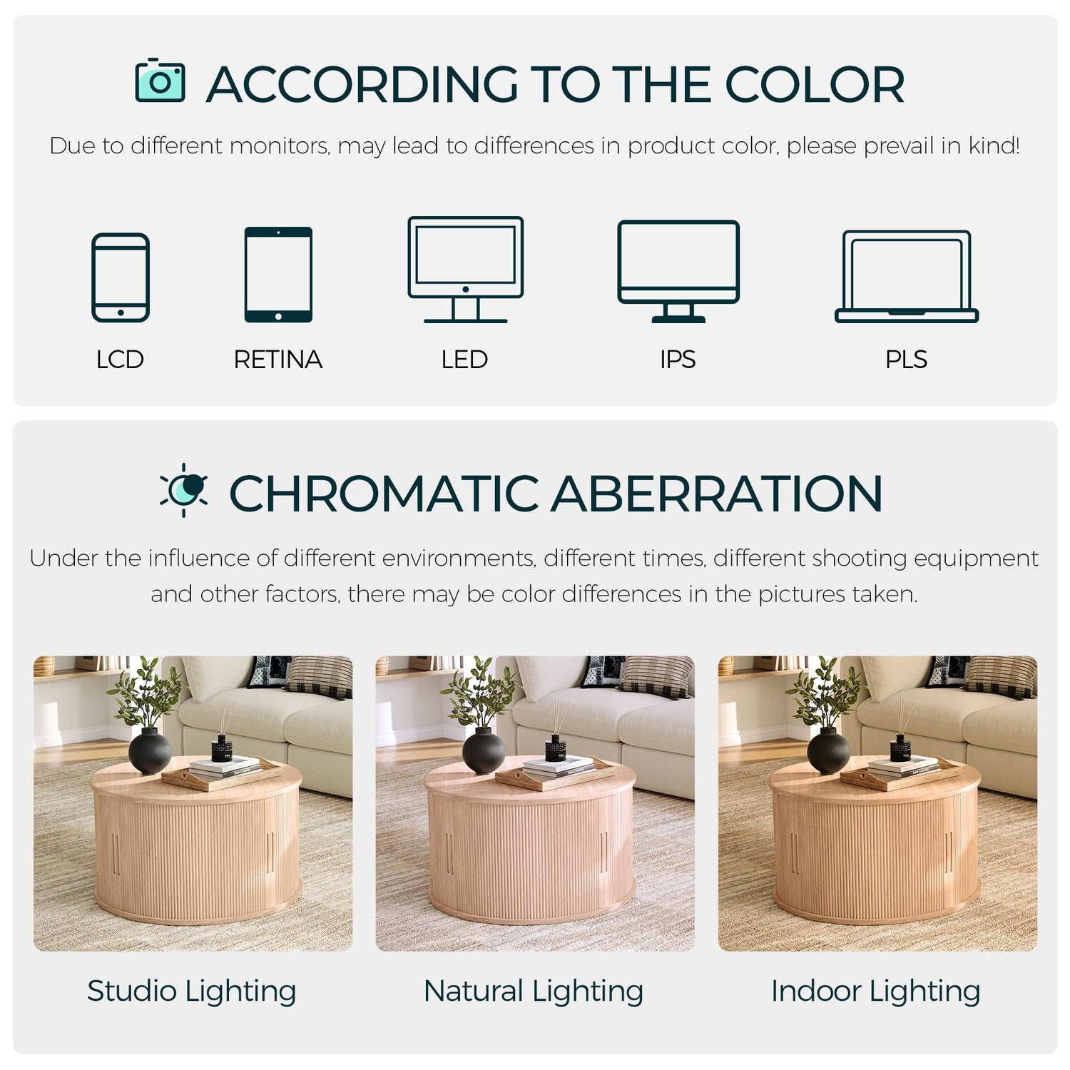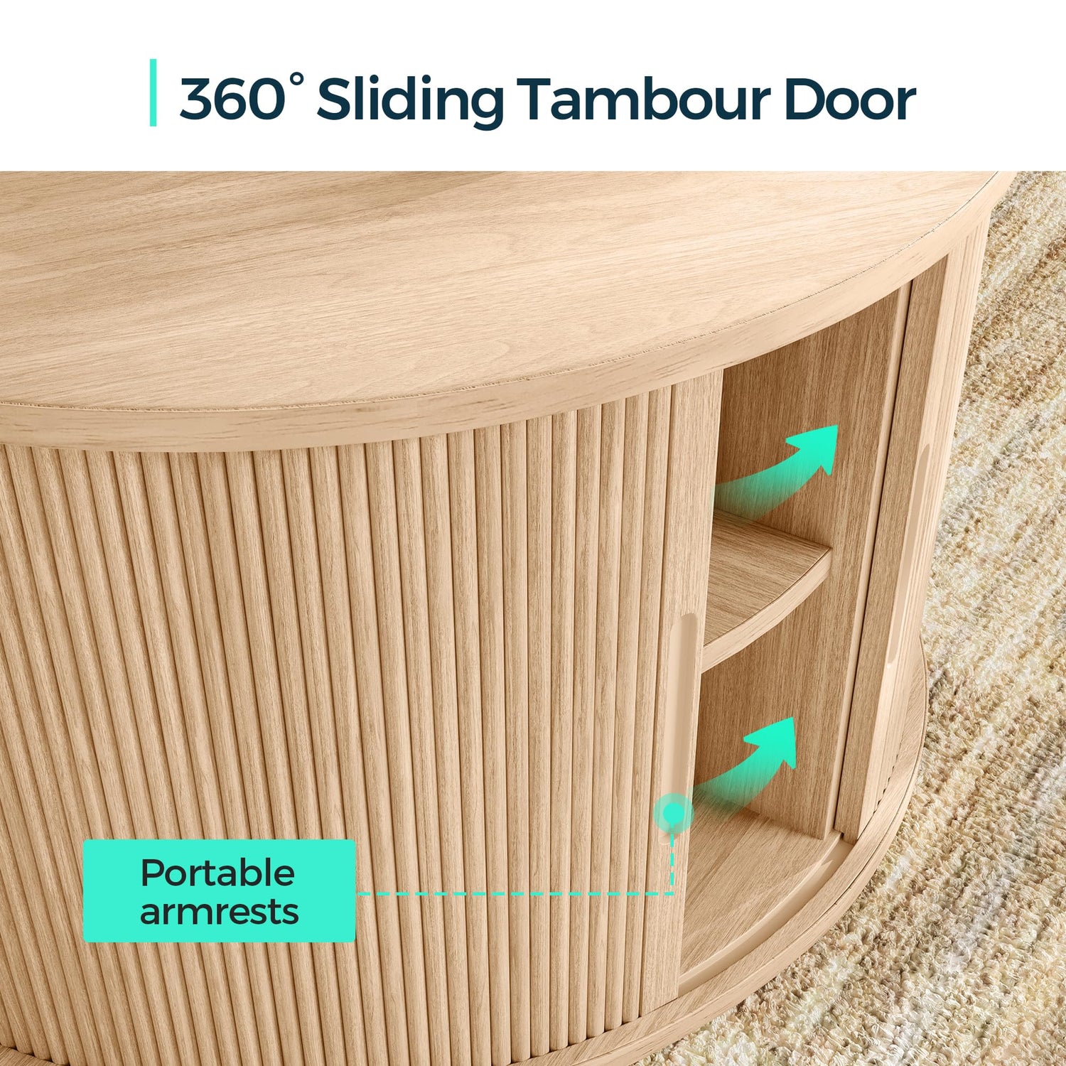 - Fluted Tambour Sliding Door - The fluted tambour door is a distinctive curved shape and slides smoothly, making this round coffee table provides convenient access to all your necessities while bringing a touch of mid-century modern style sophistication to your home
