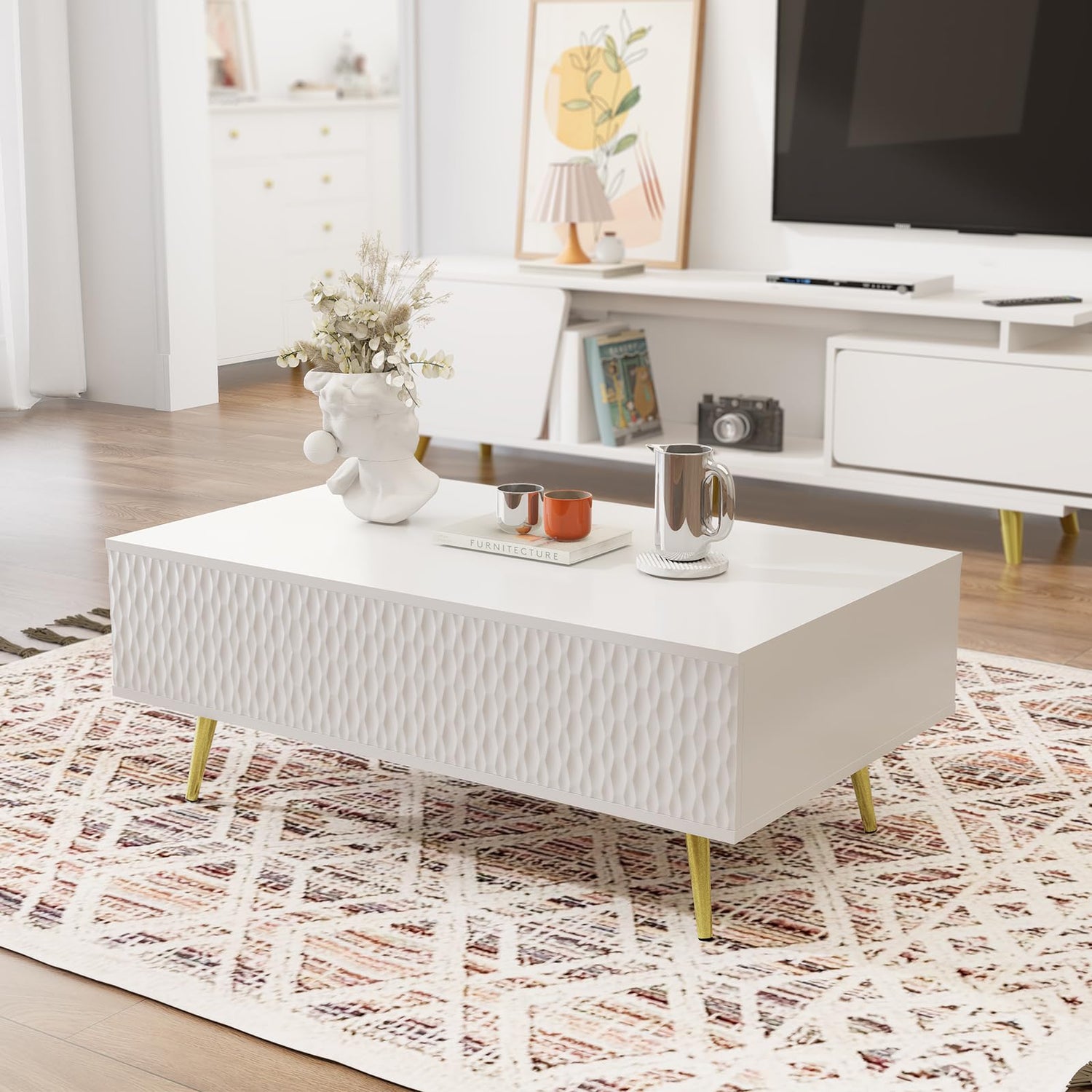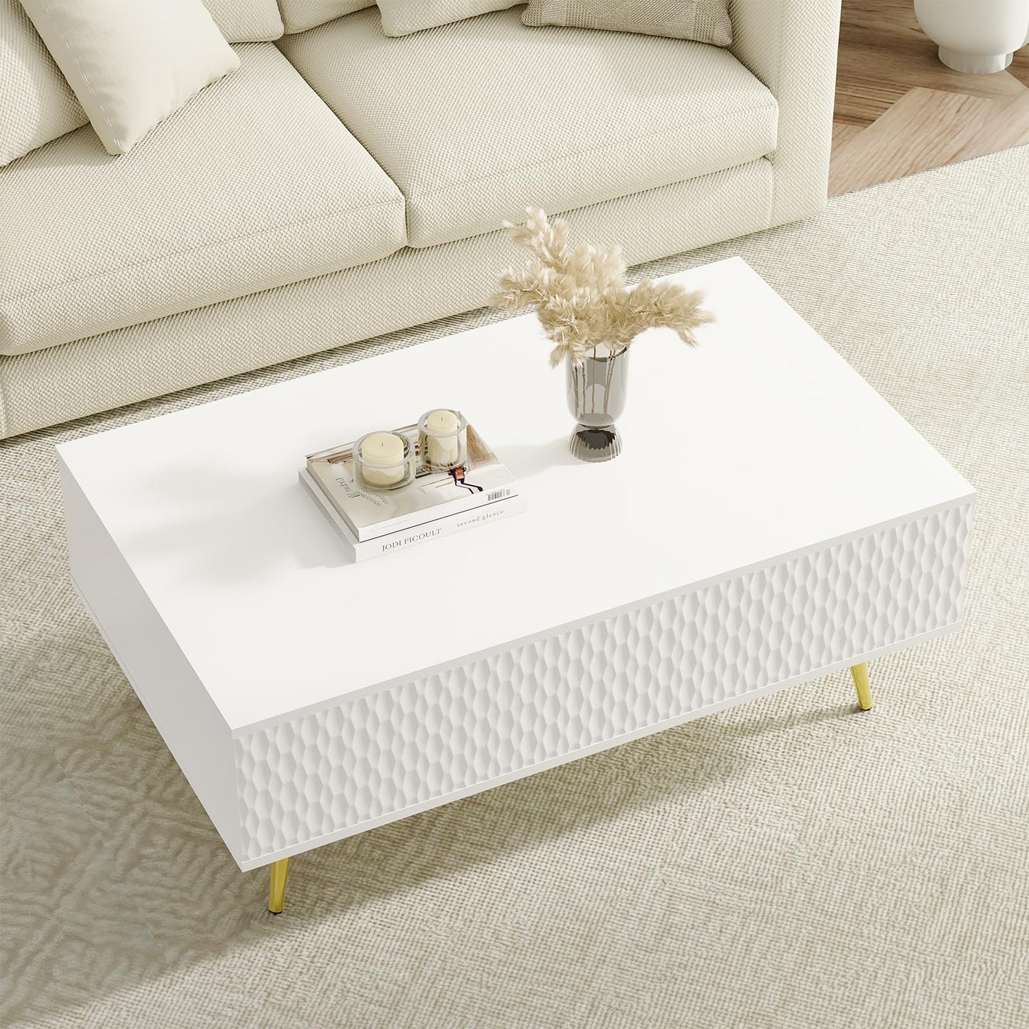 Modern Lift Top Coffee Table,39.37" White Mid Century Coffee Table with Lifting Top for Living Room, Wooden Carved Center Table with Hidden Storage Metal Legs, Fluted Panel, Adjusting to Dining Table