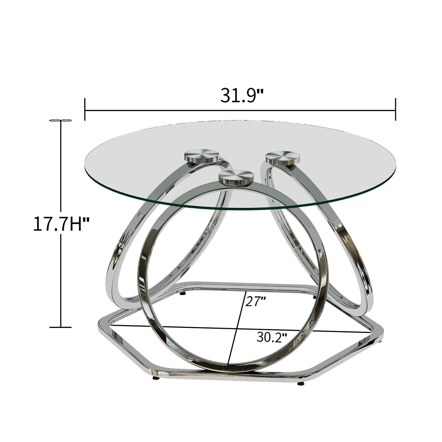 - Sleek Modern Charm: The round glass coffee table boasts a sleek and minimalist design, offering a perfect balance of elegance and versatility. The tempered glass tabletop provides a crystal-clear surface that beautifully complements the chrome finish metal frames. The unique hexagonal frame base adds a touch of geometric flair, making it a statement piece that effortlessly enhances the aesthetic of your living room