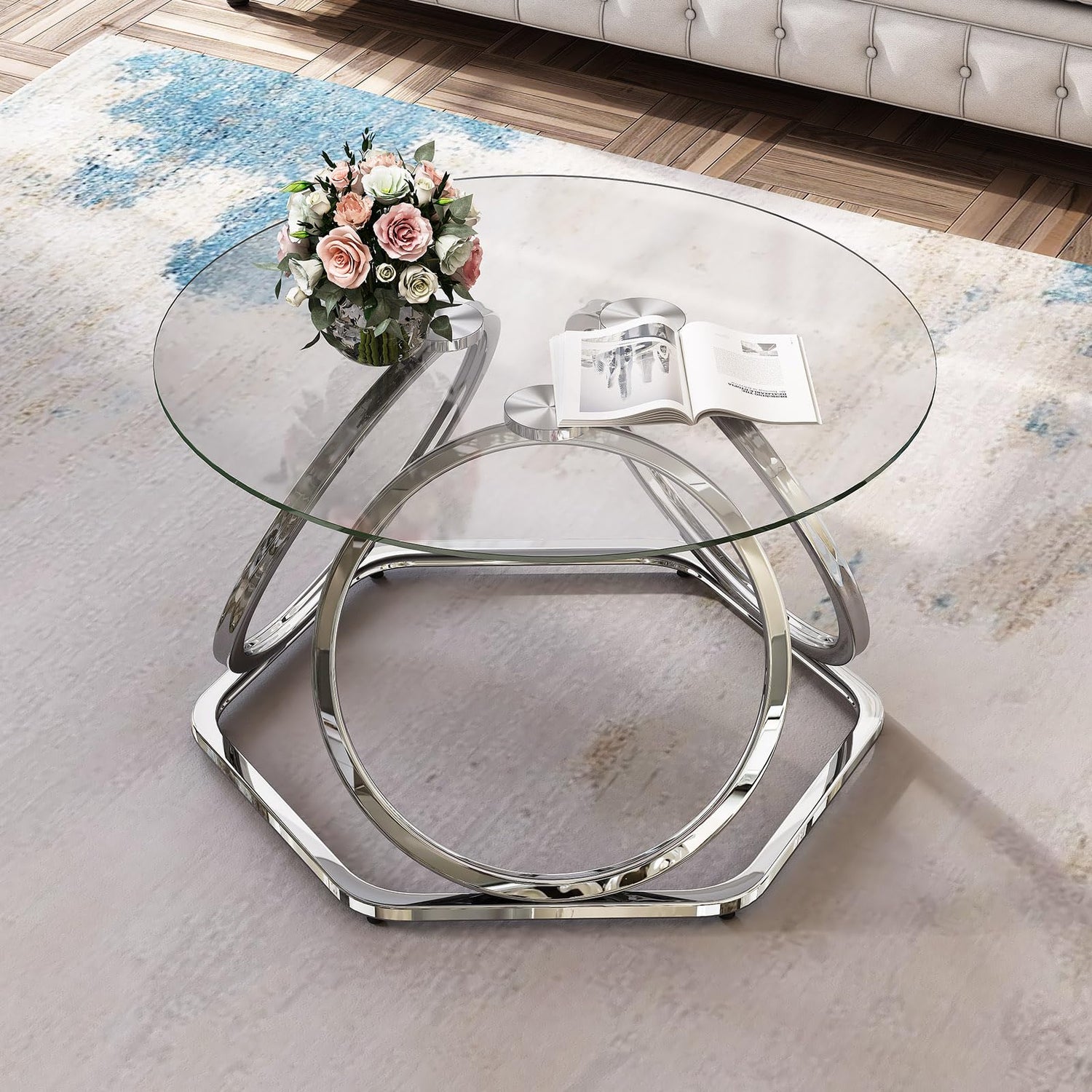 O&K FURNITURE Glass Coffee Table, Modern Silver Coffee Table Living Room Table with Hexagonal Base, Round Coffee Table for Home&Office, Chrome Finish, 1 PC