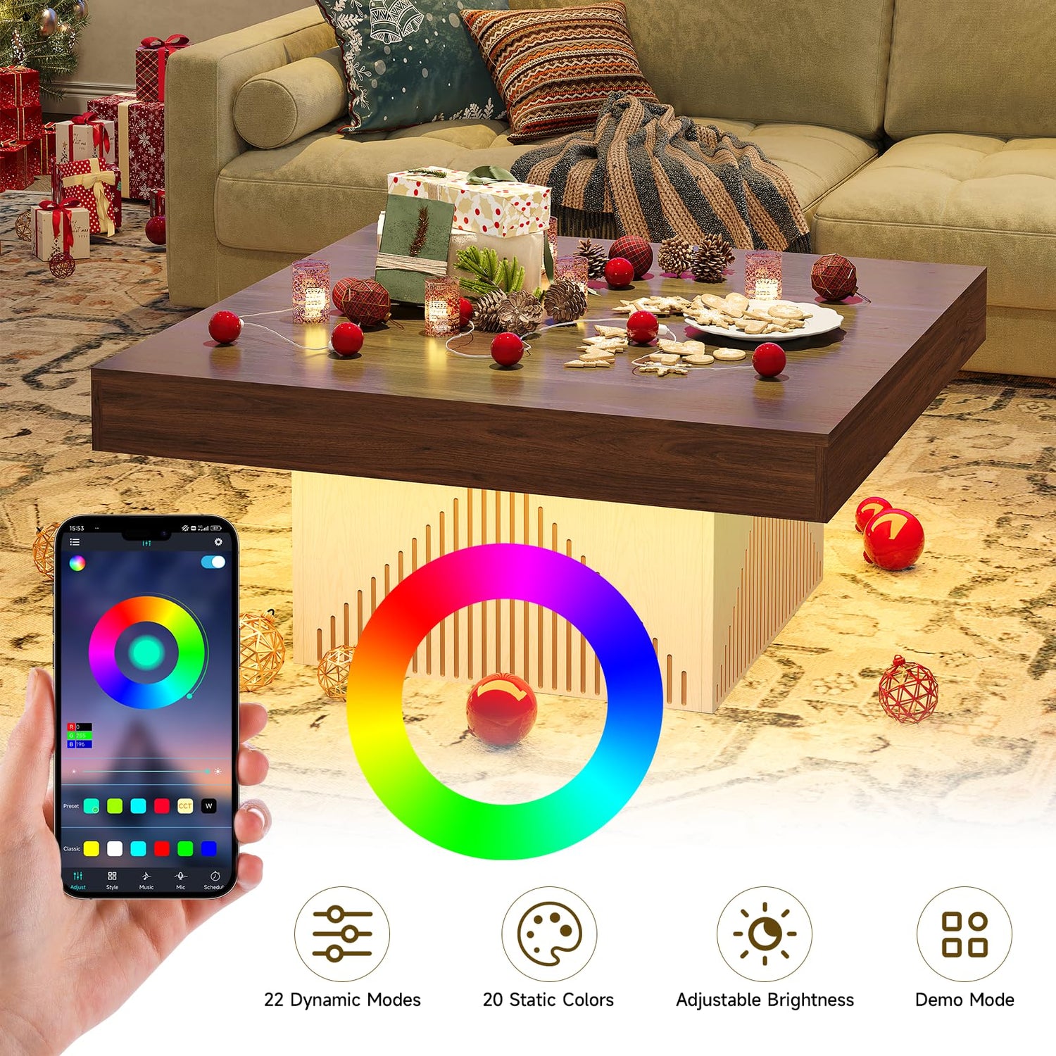 - Spacious & Versatile: Measuring a generous 35.4” x 35.4”, this large coffee table is ideal for game nights, parties, or family gatherings. Its ample surface is perfect for your laptop, books, vases, drinks, snacks, and more. The built-in LED lighting creates a cozy, inviting atmosphere—perfect for winding down with a cocktail after a long day