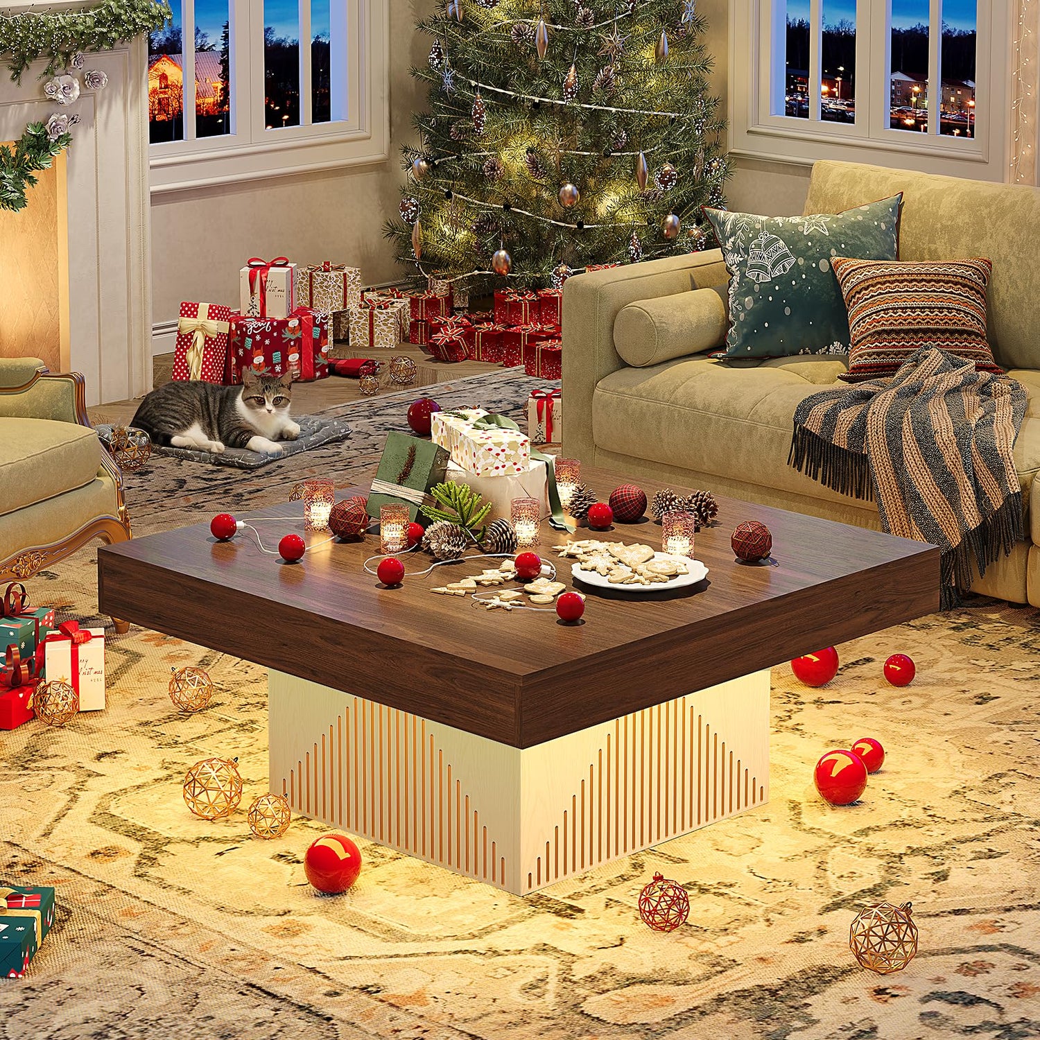 ONBRILL Coffee Table, Square Coffee Table with LED, Wood Low Coffee Table for Living Room, Center Table for Living Room, Natural Wood Grain - Rustic Brown+White