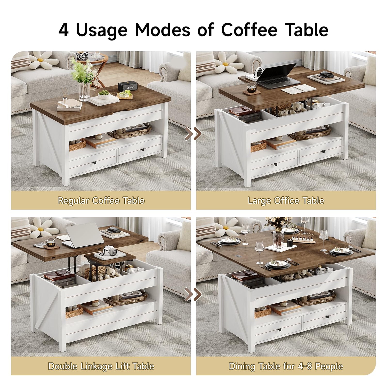 ONBRILL Farmhouse Lift Top Coffee Table with 2 Storage Drawers, Rustic Center Table with Large Hidden Storage Compartment,Storage Coffee Table Converts to Dining Table for Living Room, Brown and White