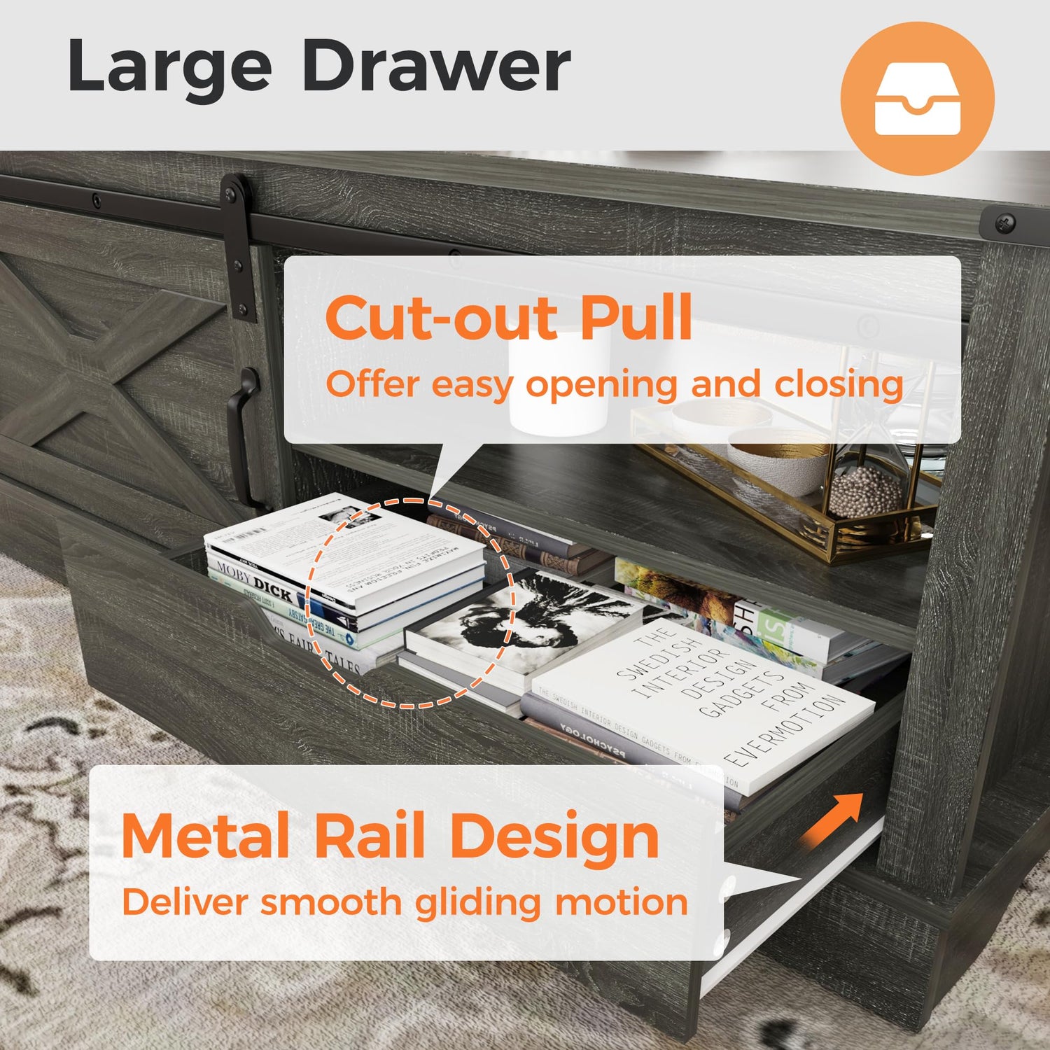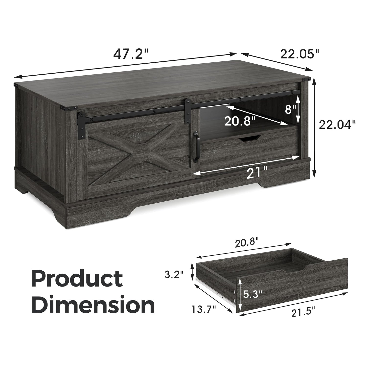 • 【Sliding Barn Door】Our farmhouse coffee table features a single sliding door, enabling you to effortlessly hide personal items or display frequently used ones. In contrast to hinged doors, it saves space by eliminating the need for swinging.