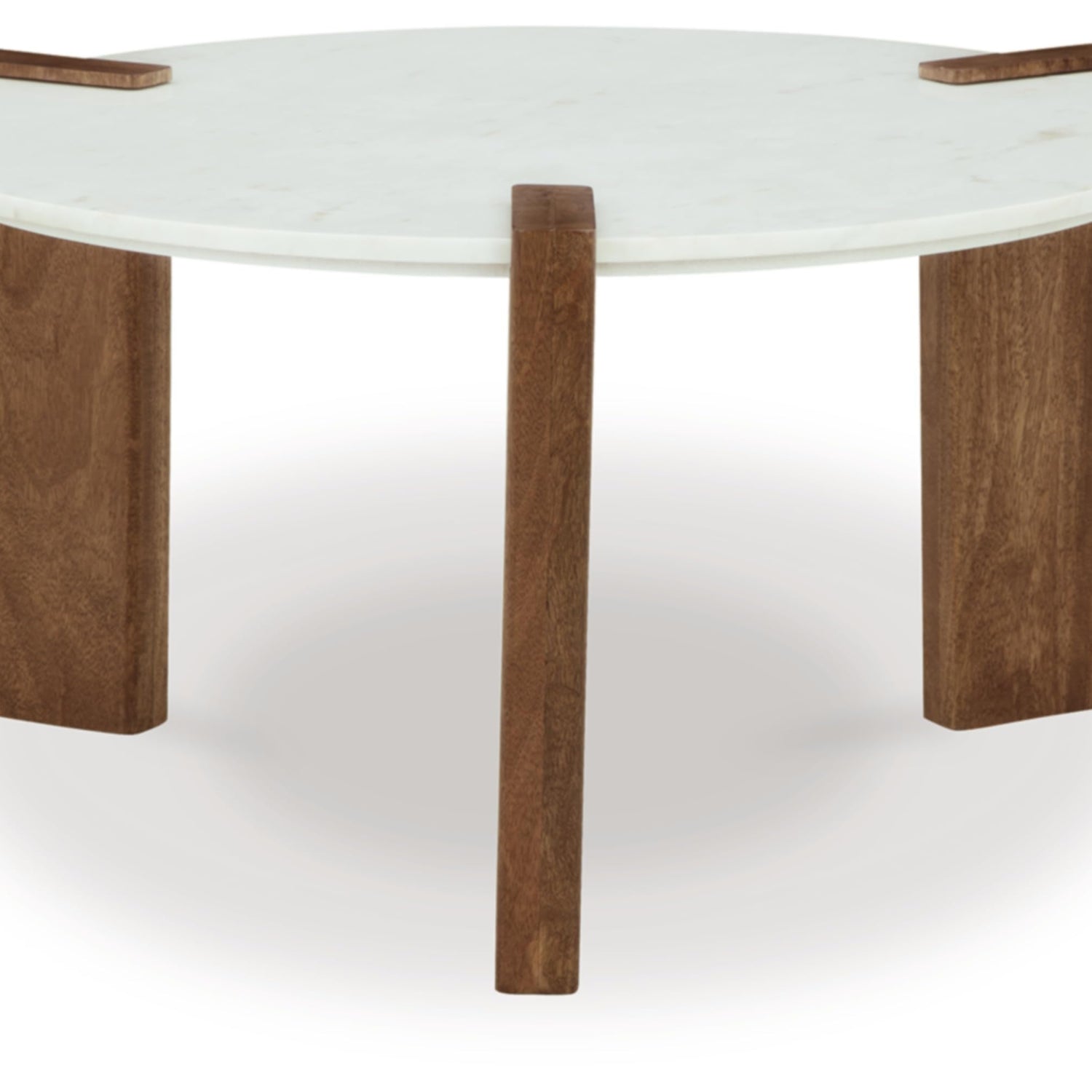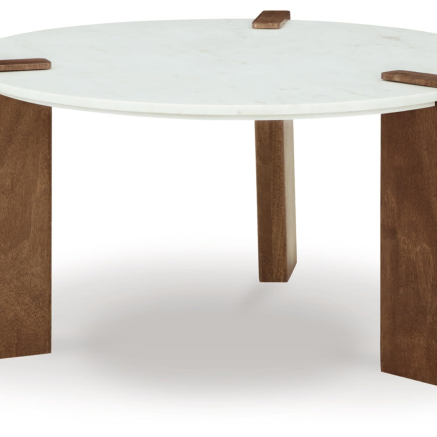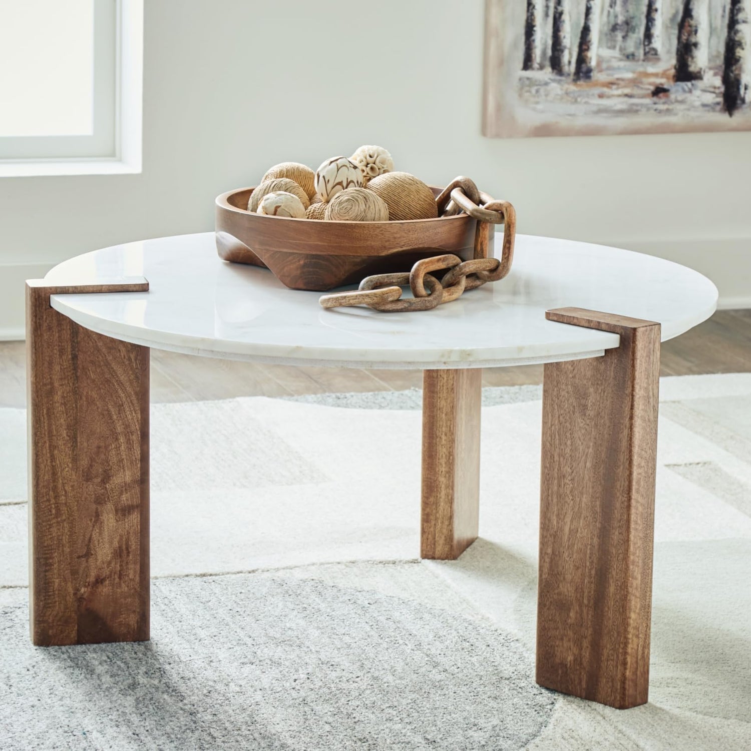 Details: With its back-to-nature sensibility, this coffee table is a natural fit for outfitting your modern living area. Its clean-lined design lets the beautifully organic quality of the mango wood shine through, complemented by the sleek refinement of a marble top. This table is the ideal spot for snacks, beverages and that stack of unread books. Signature Design by Ashley is a registered trademark of Ashley Furniture Industries, Inc.