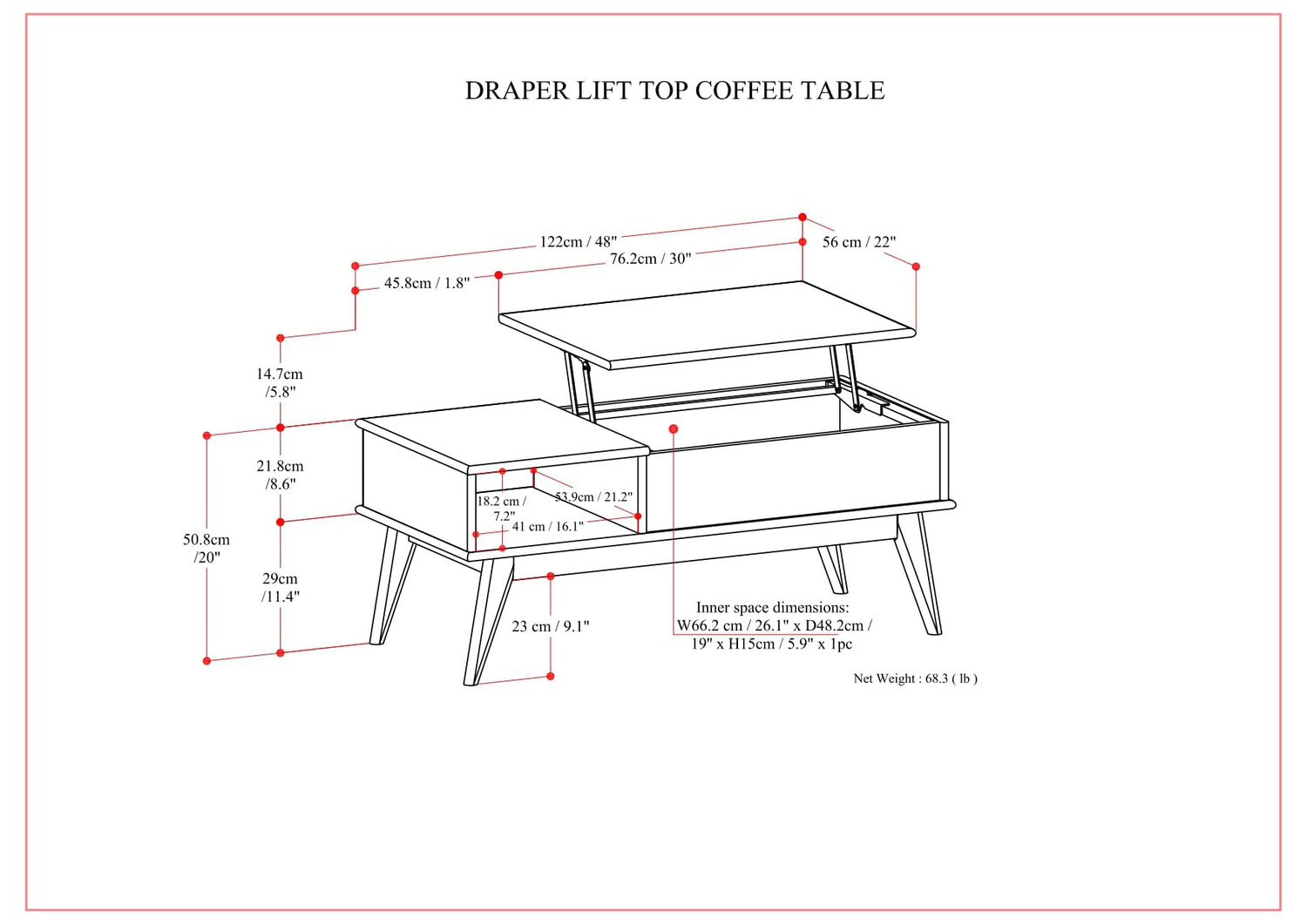 Details: You have a beautiful sofa but there is something missing. It could be this stylish modern Draper Mid Century Lift Top Coffee Table. This coffee table fills so many needs. Half of the top lifts to reveal hidden storage, pulling toward you for the perfect surface to type on your laptop or eat in front of the television. The open pass through is perfect for stowing your books or games. keeping the beautiful warm-toned top clear of clutter.