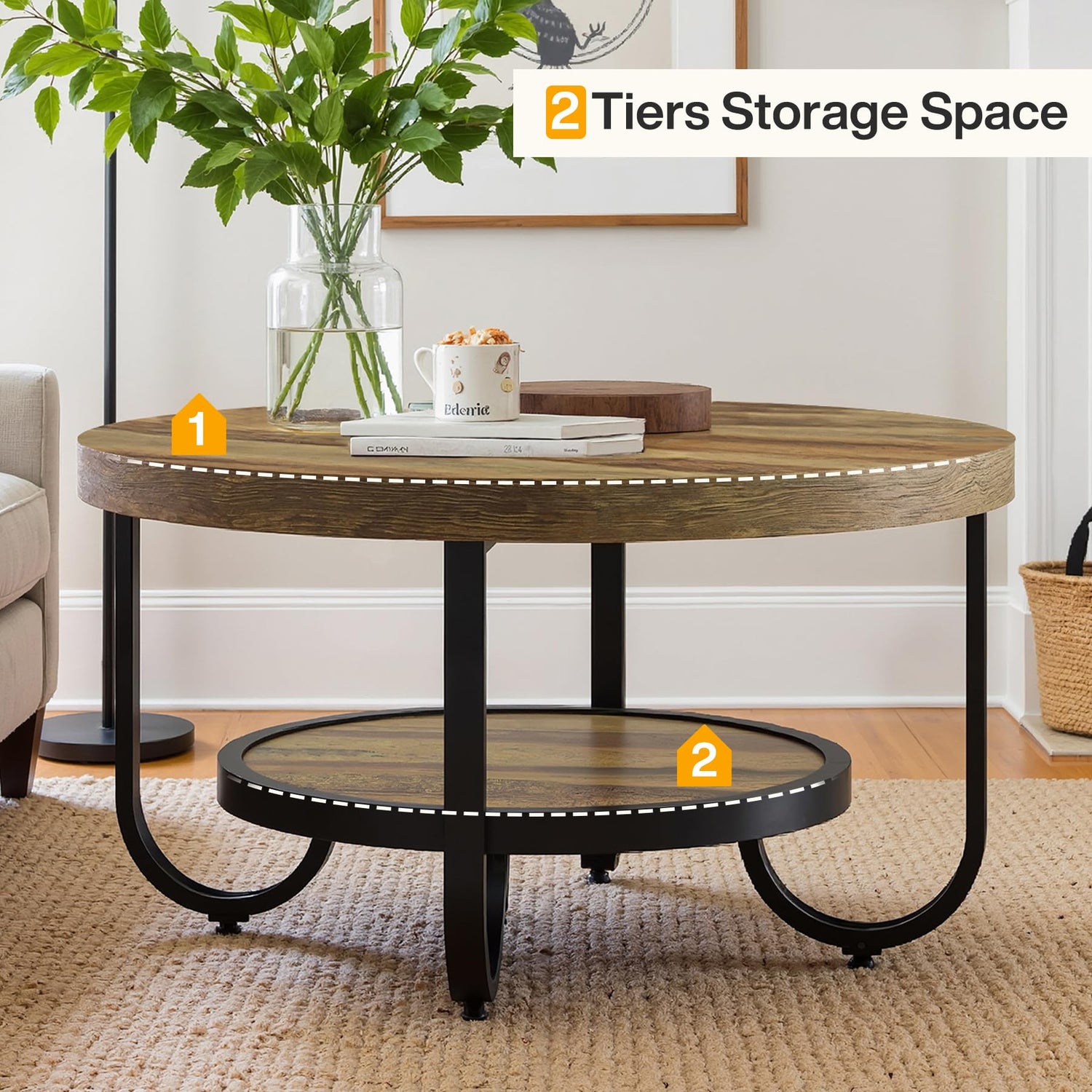 - Spacious Storage Space: This circle coffee table features a spacious 31.1-inch diameter top, providing ample room for daily essentials, keeping them within easy reach. The 19.69-inch bottom shelf adds extra storage for tissue boxes, diffusers, books